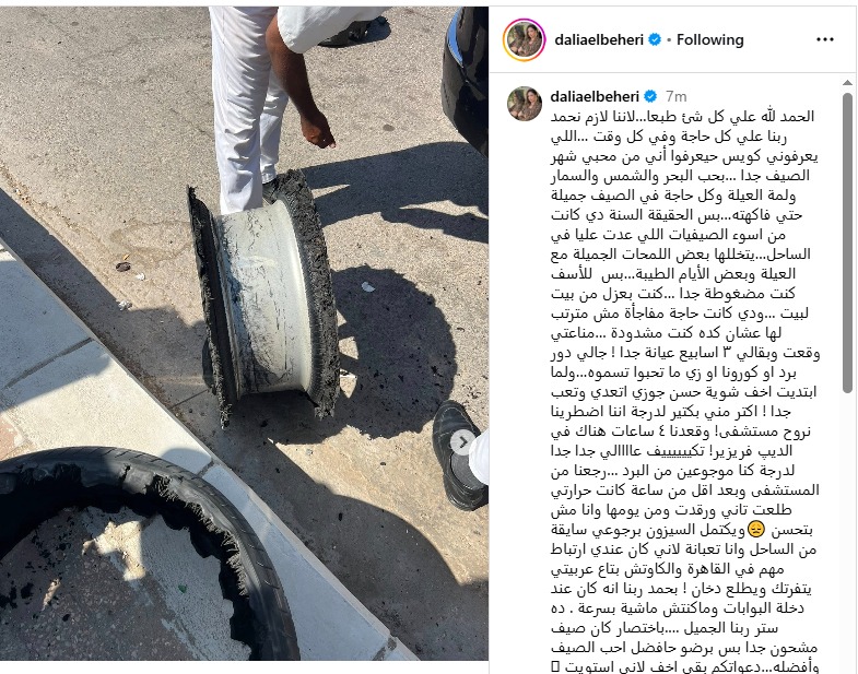 ونشرت داليا صورة لها من الحادث، عر حسابها الشخصي بـ إنستجرام، وعلقت عليها: "الحمد لله على كل شيء طبعا، لأننا لازم نحمد ربنا على كل حاجة وفي كل وقت، اللي يعرفوني كويس هيعرفوا أني من محبي شهر الصيف جدا، بحب البحر والشمس والسمار ولمة العيلة وكل حاجة في الصيف جميلة حتي فاكهت، بس الحقيقة السنة دي كانت من اسوء الصيفيات اللي عدت عليا في الساحل، يتخللها بعض اللمحات الجميلة مع العيلة وبعض الأيام الطيبة، للأسف كنت مضغوطة جدا، كنت بعزل من بيت لبيت، ودي كانت حاجة مفاجأة مش مترتب لها عشان كده كنت مشدودة".