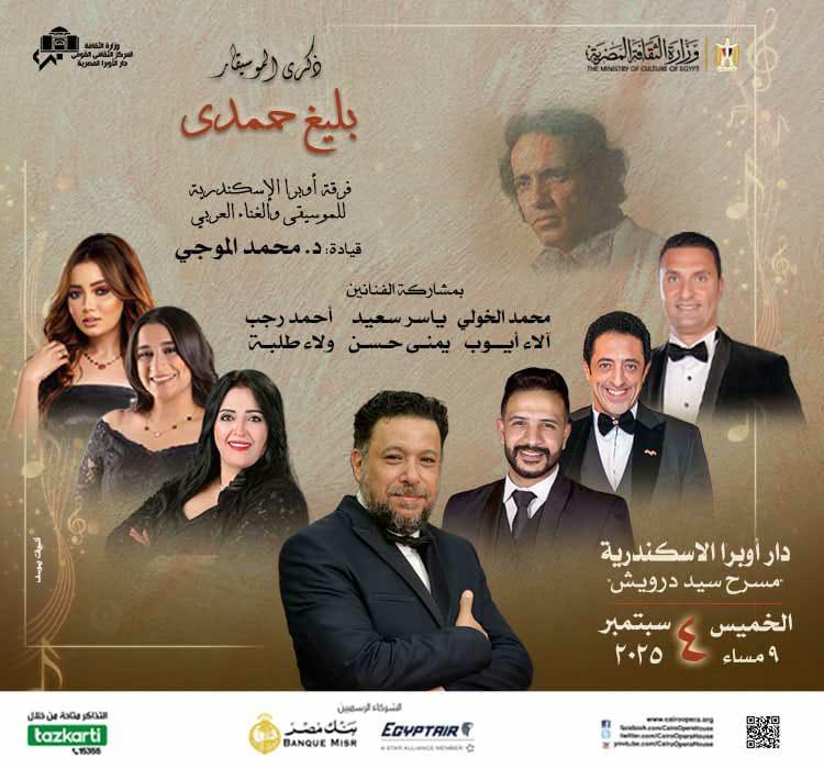 ضمن خطط الإحتفاء برموز وأعلام الموسيقى والغناء تحيى وزارة الثقافة من خلال دار الأوبرا المصرية برئاسة الدكتور علاء عبد السلام ذكرى رحيل الموسيقار بليغ حمدى فى حفل فرقة أوبرا الأسكندرية للموسيقى والغناء العربى المقام بقيادة المايسترو الدكتور محمد الموجى وذلك فى التاسعة مساء الخميس 4 سبتمبر على مسرح سيد درويش " أوبرا الإسكندرية " .