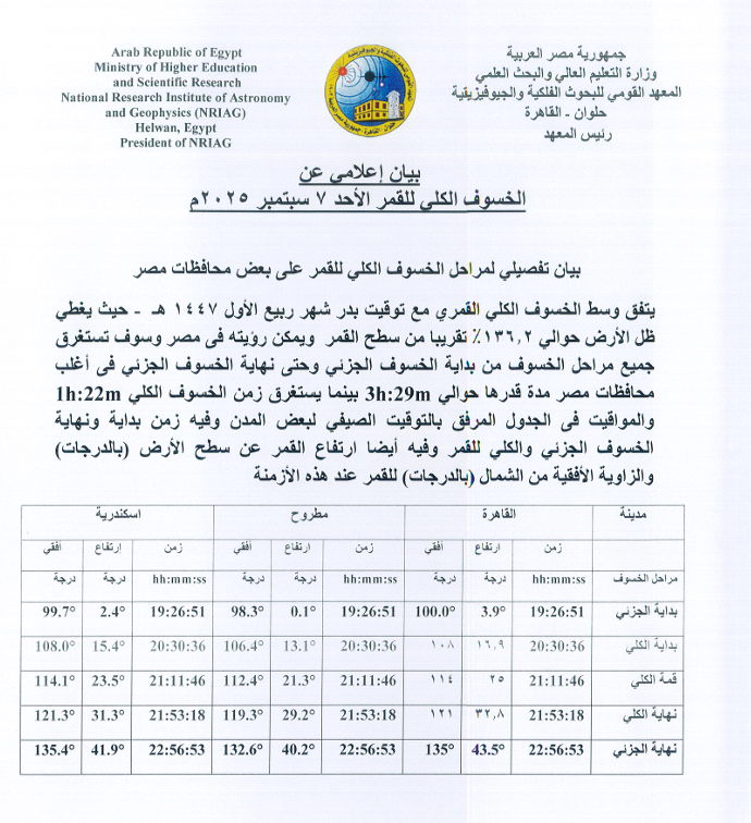 أعلن المعهد القومي للبحوث الفلكية والجيوفيزيقية أن مصر ستشهد خسوفًا كليًا للقمر يوم الأحد 7 سبتمبر 2025، يمكن رؤيته بوضوح في جميع المحافظات.