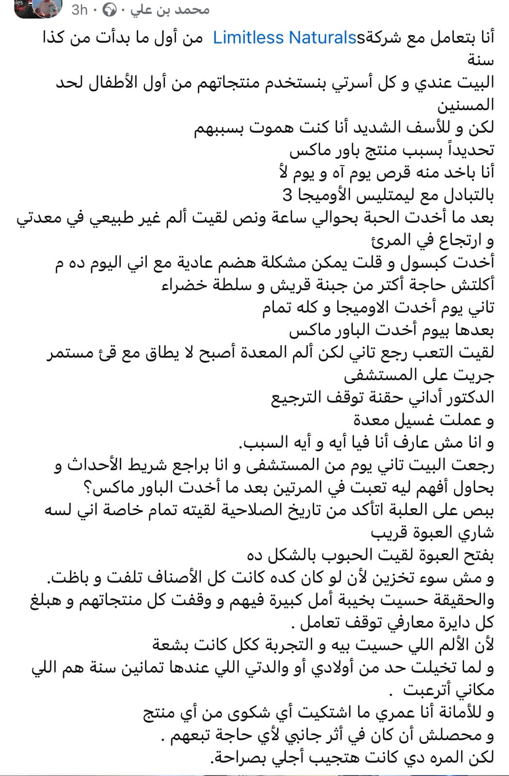 وقال صاحب المشكلة،" أنا بتعامل مع شركةLimitless Naturalss من أول ما بدأت من كذا سنة البيت عندي و كل أسرتي بنستخدم منتجاتهم من أول الأطفال لحد المسنين لكن و للأسف الشديد أنا كنت هموت بسببهم تحديداً بسبب منتج باور ماكس.. أنا باخد منه قرص يوم آه و يوم لأ بالتبادل مع ليمتليس الأوميجا 3 بعد ما أخدت الحبة بحوالي ساعة ونص لقيت ألم غير طبيعي في معدتي و ارتجاع في المرئ
