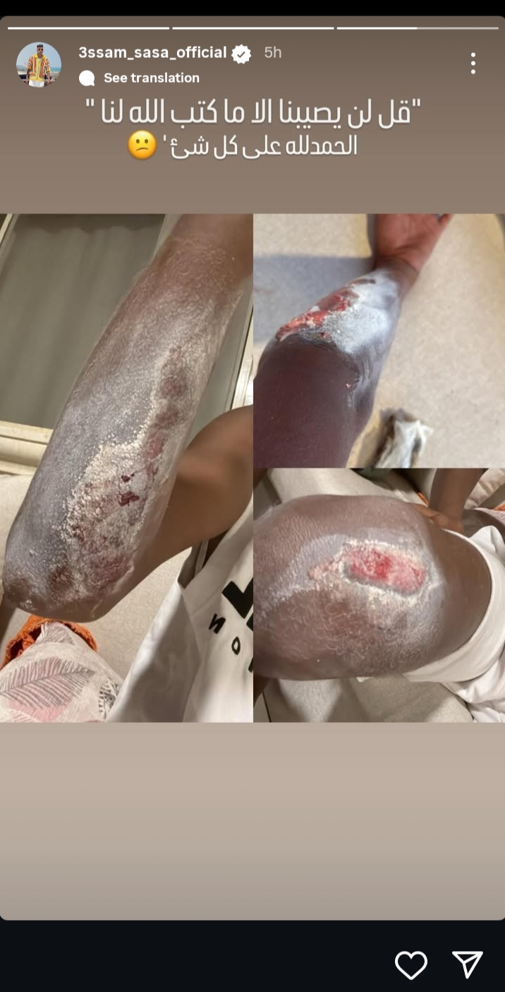 ونشر عصام صاصا صور توضح الإصابة من خلال حسابه الرسمي عبر موقع تبادل الصور والفيديوهات القصيرة "إنستجرام"، عبر خاصية استوري، وكتب:"قل لن يصيبنا إلا ما كتب الله لنا.. الحمد لله على كل شئ"، مما أثار قلق جمهوره ومتابعية، كما انهالت عليه التعليقات، متمنين له الشفاء العاجل.