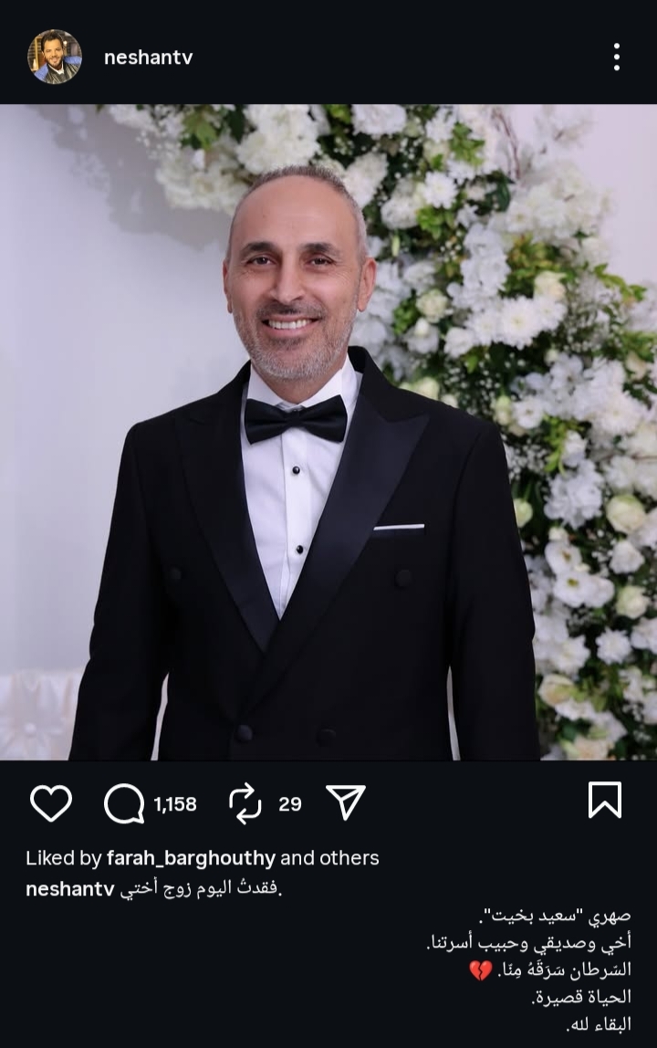 ونشر نيشان صورة لـ"زوج شقيقته"، من خلال حسابه الرسمي عبر موقع تبادل الصور والفيديوهات القصيرة، وكتب: "فقدت اليوم زوج أختي صهري سعيد بخيت، أخي وصديقي وحبيب أسرتنا.. السرطان سرقه منا.. الحياة قصيرة، البقاء لله".