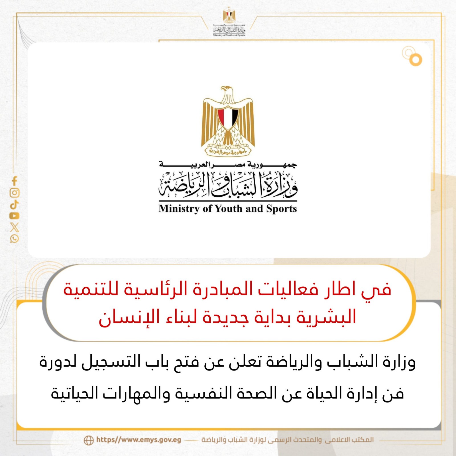 تعلن وزارة الشباب والرياضة من خلال الإدارة المركزية لشؤون مكتب الوزير مكنب "فن إدارة الحياة"، عن فتح باب التسجيل في الدورة المجانية المكونة من ٣ مراحل ضمن دورات "فن إدارة الحياة"