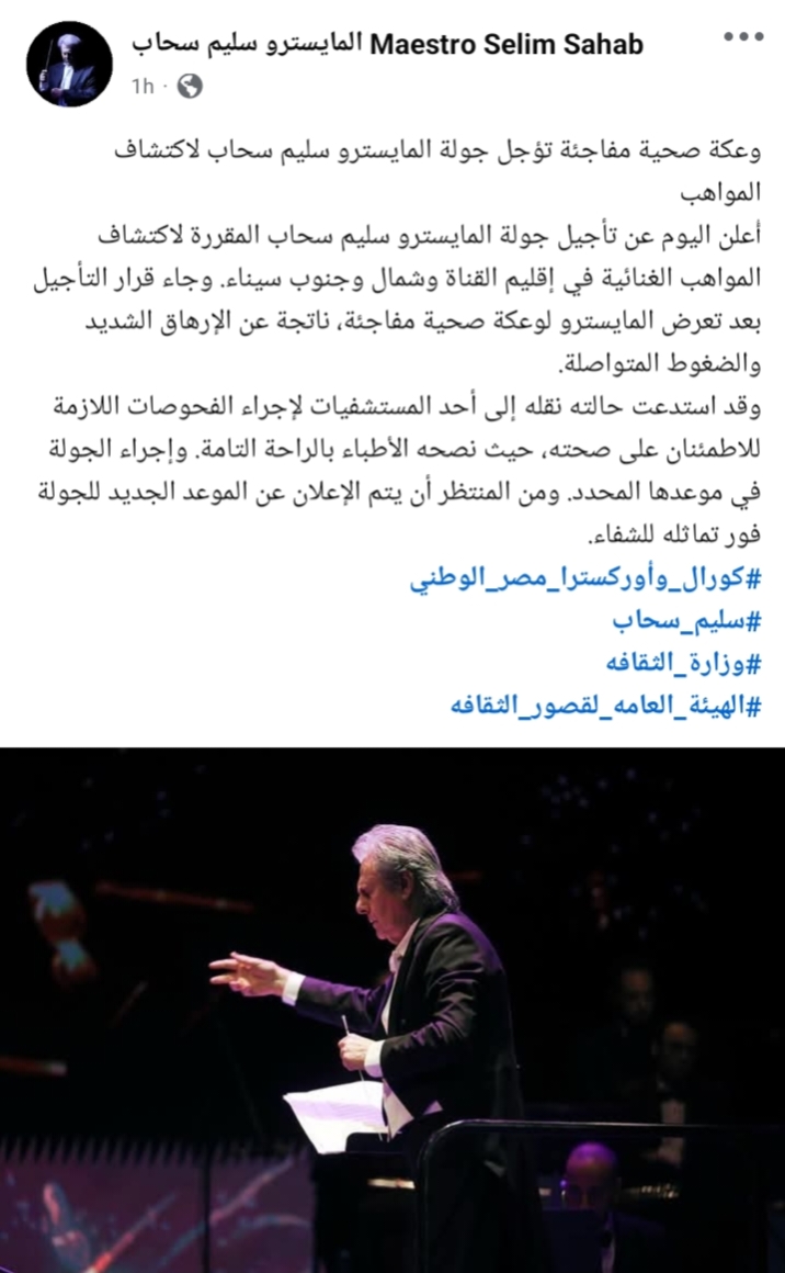 ونشرت الصفحة الرسمية لـ المايسترو سليم سحاب من خلال موقع التواصل الاجتماعي "فيسبوك"، كتب:" وعكة صحية مفاجئة تؤجل جولة المايسترو سليم سحاب لاكتشاف المواهب أُعلن اليوم عن تأجيل جولة المايسترو سليم سحاب المقررة لاكتشاف المواهب الغنائية في إقليم القناة وشمال وجنوب سيناء".