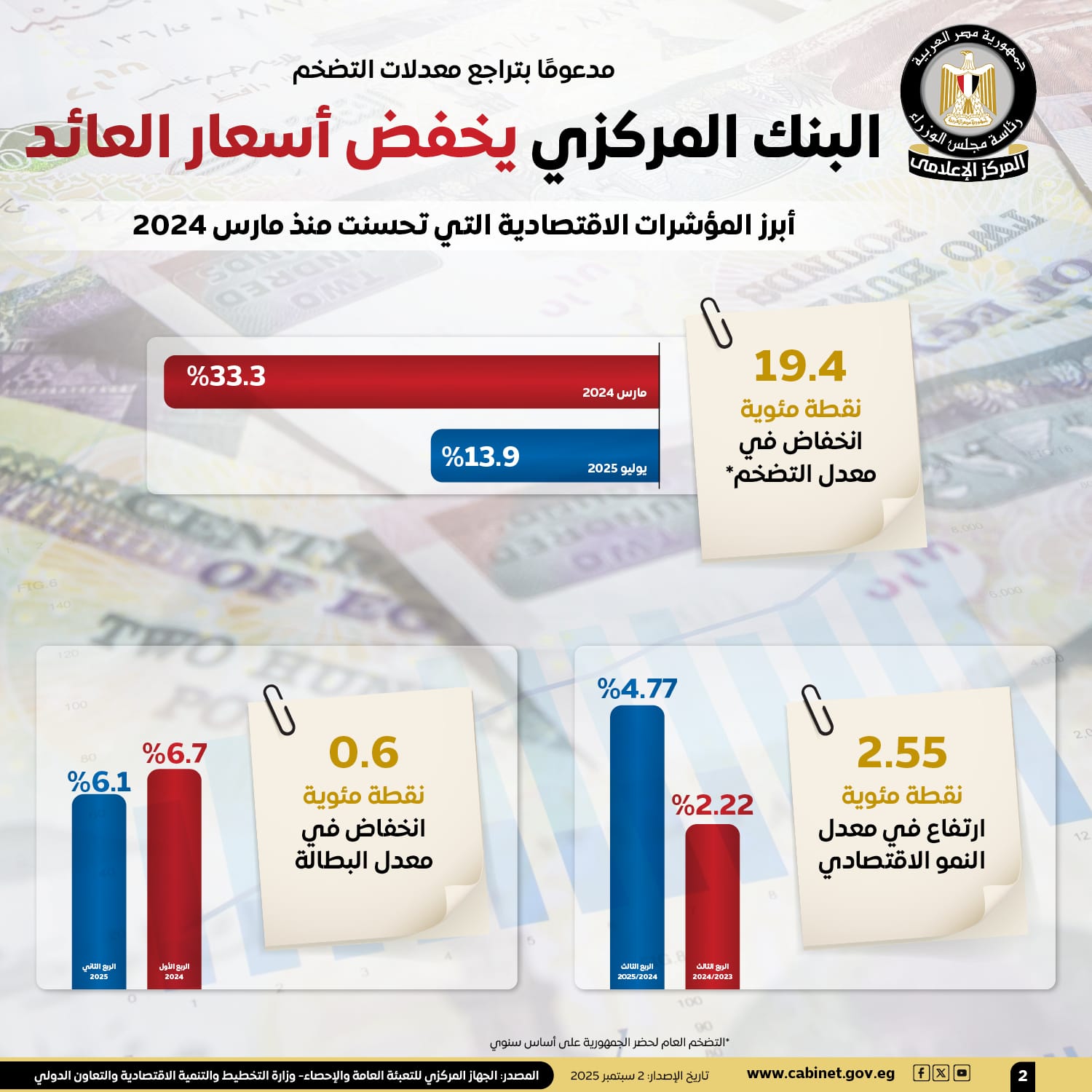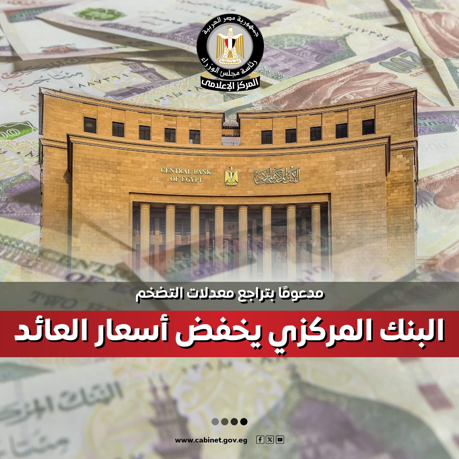 نشر المركز الإعلامي لمجلس الوزراء عددًا من الإنفوجرافات عبر منصاته على مواقع التواصل الاجتماعي، سلط من خلالها الضوء على قرار البنك المركزي بخفض أسعار العائد، مدعومًا بتراجع معدلات التضخم.