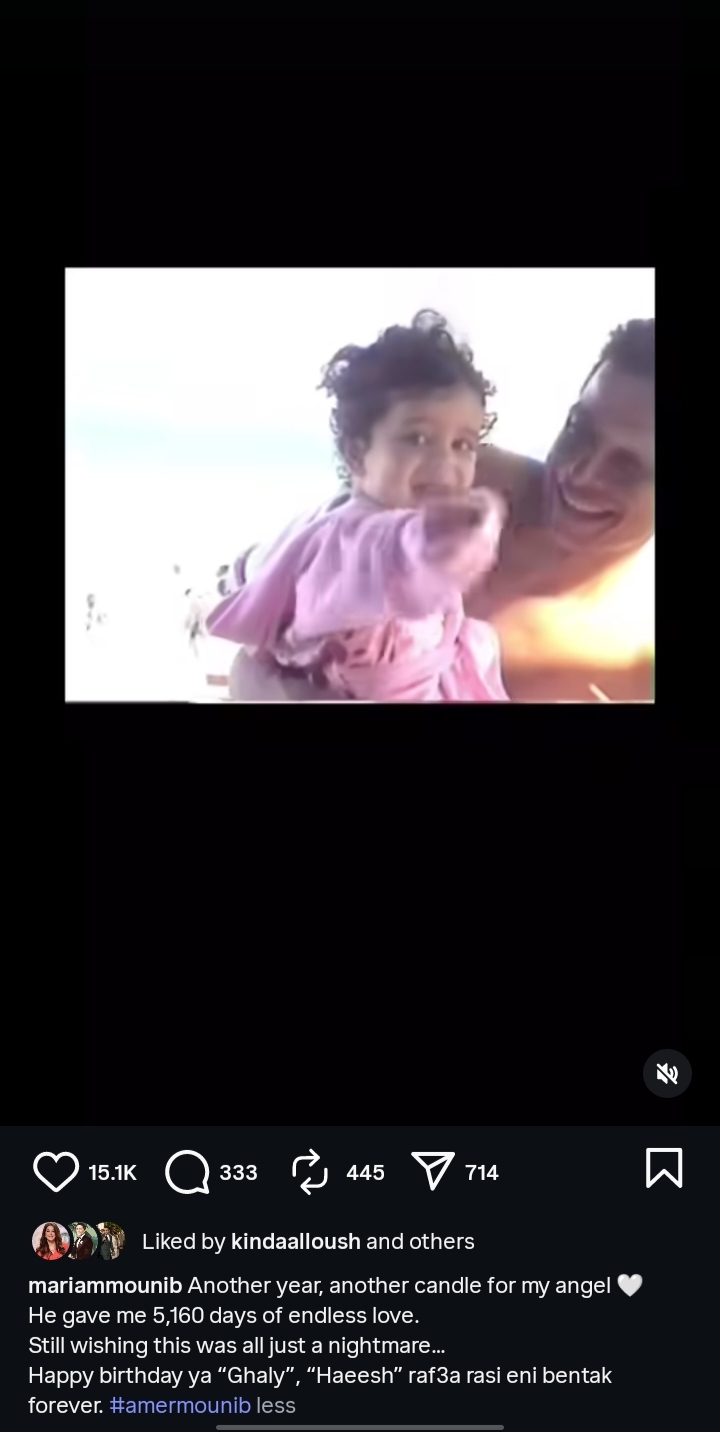 ونشرت مريم عامر منيب فيديو يجمعها بوالدها أثناء الطفولة، من خلال حسابها الرسمي عبر موقع تبادل الصور والفيديوهات القصيرة "إنستجرام"، وكتبت:"عام آخر وشمعة أخرى لملاكي .. لقد منحني 5160 يومًا من الحب اللامتناهي .. وما زلت أتمنى لو كان كل هذا مجرد كابوس .. عيد ميلاد سعيد يا غالي .. هعيش رافعة راسي إني بنتك للأبد".