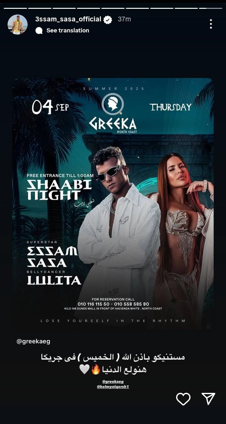 ومن المقرر أن يحيي عصام صاصا الحفل يوم الخميس المقبل الموافق 4 سبتمبر في جريكا، ونشر عصام صاصا البوستر الخاص بالحفل، من خلال حسابه الرسمي عبر موقع تبادل الصور والفيديوهات القصيرة إنستجرام، عبر خاصية ستوري، وكتب: "مستنيكوا بإذن الله الخميس في جريكا هنولع الدنيا".