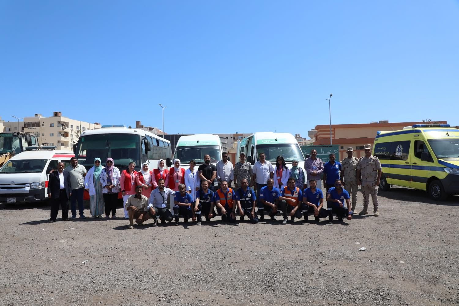رافق السكرتير العام العقيد طيار أركان حرب خالد ابراهيم محمد المستشار العسكرى للمحافظة، الدكتور إسماعيل العربي مدير مديرية الشئون الصحية، محمد رياض مدير مركز سيطرة الشبكة الوطنية للطواريء والسلامة العامة، والعديد من مسؤولي الجهات المشاركة في التدريب العملي المشترك من مرفق الإسعاف، شركة مياه الشرب والصرف الصحي، شركة القناة لتوزيع الكهرباء، مديرية التموين، مجلس مدينة الغردقة، شركة بتروسيف للخدمات البترولية.