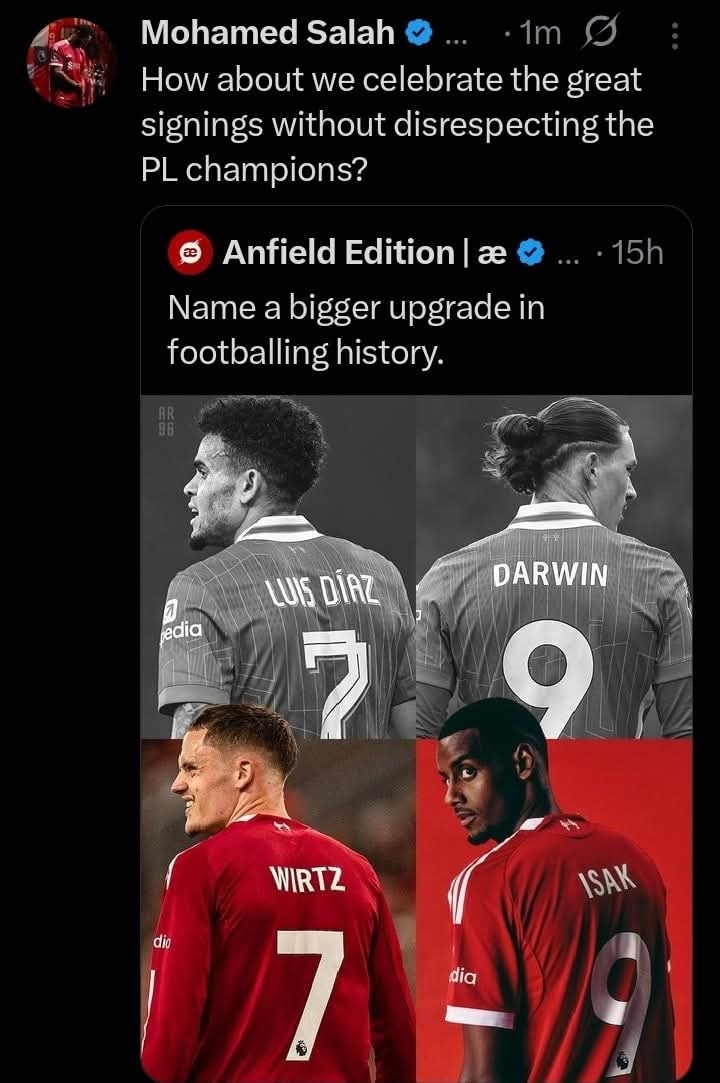 وجّه محمد صلاح، نجم ليفربول وقائد منتخب مصر، رسالة عبر حسابه الرسمي بموقع "إكس"، ردًا على أحد الحسابات الداعمة للنادي الذي حاول التقليل من دور لويس دياز وداروين نونيز بعد التعاقد مع لاعبين جدد.