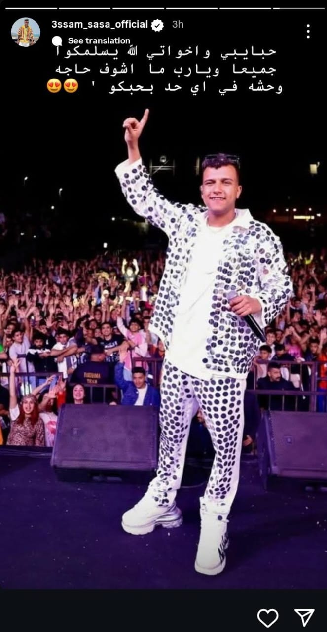 ونشر عصام صاصا صورة له، من خلال حسابه الرسمي عبر موقع تبادل الصور والفيديوهات القصيرة "إنستجرام"، عبر خاصية ستوري، قال: "حبايبي وإخواتي الله يسلمكوا جميعًا، ويارب ما أشوف حاجة وحشة في أي حد.. بحبكو".