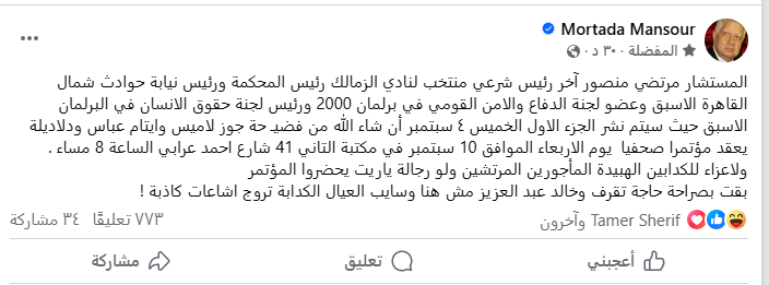 وتابع المستشار مرتضي منصور فى منشوره :" أنه ىخر رئيس شرعى منتخب لنادى الزمالك.. لاعزاء للكدابين الهبيدة المأجورين المرتشين “ متحديا حضورهم المؤتمر الصحفي قائلا ”لو رجالة ياريت يحضروا المؤتمر الصحفي".