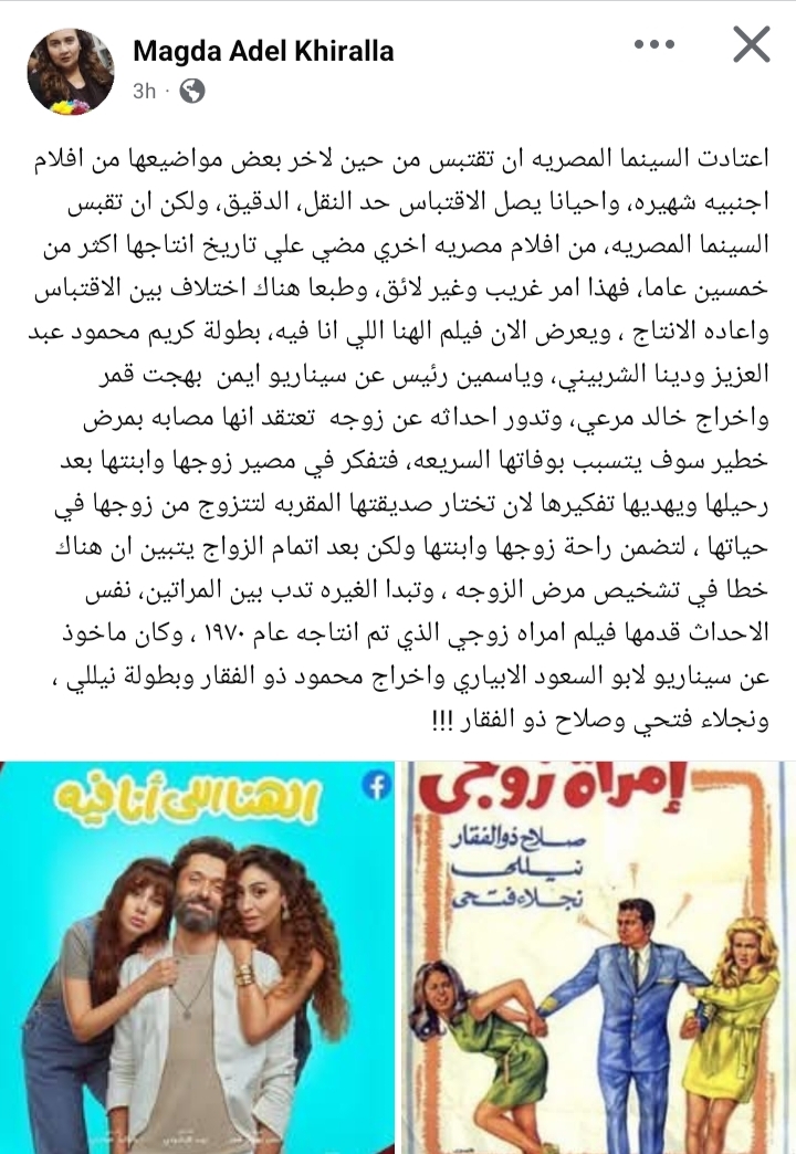 وكتبت من خلال حسابها الرسمي عبر موقع التواصل الاجتماعي فيسبوك، قالت: "اعتادت السينما المصريه ان تقتبس من حين لاخر بعض مواضيعها من افلام اجنبيه شهيره، واحيانا يصل الاقتباس حد النقل، الدقيق، ولكن ان تقبس السينما المصريه، من افلام مصريه اخري مضي علي تاريخ انتاجها اكثر من خمسين عاما، فهذا امر غريب وغير لائق".