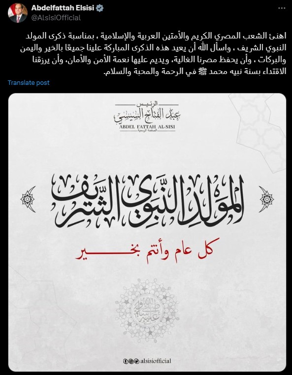 وكتب عبر حسابه الرسمي عبر موقع التواصل الاجتماعي “إكس”، قائلًا:"اهنئ الشعب المصري الكريم والأمتين العربية والإسلامية ، بمناسبة ذكرى المولد النبوي الشريف، واسأل الله أن يعيد هذه الذكرى المباركة علينا جميعًا بالخير واليمن والبركات، وأن يحفظ مصرنا الغالية، ويديم عليها نعمة الأمن والأمان، وأن يرزقنا الاقتداء بسنة نبيه محمد ﷺ في الرحمة والمحبة والسلام".