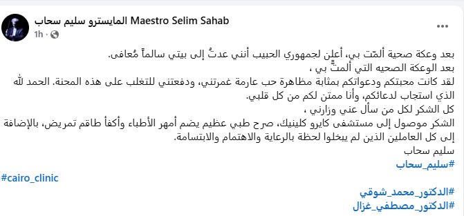 تابع: "كل الشكر لكل من سأل عني وزارني ، الشكر موصول إلى مستشفى كايرو كلينيك، صرح طبي عظيم يضم أمهر الأطباء وأكفأ طاقم تمريض، بالإضافة إلى كل العاملين الذين لم يبخلوا لحظة بالرعاية والاهتمام والابتسامة".