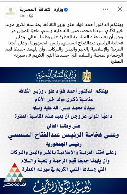 قدّم الدكتور أحمد فؤاد هنو، وزير الثقافة، التهنئة بمناسبة ذكرى مولد خير الأنام، سيدنا محمد صلى الله عليه وسلم، داعيًا المولى عز وجل أن يعيد هذه المناسبة العطرة على وطننا الغالي، وعلى الرئيس عبدالفتاح السيسي، رئيس الجمهورية، وعلى أمتنا العربية والإسلامية بالخير واليمن والبركات، وأن يلهمنا جميعًا قيم الرحمة والمحبة والسلام التي جسدها النبي الكريم في سيرته العطرة.