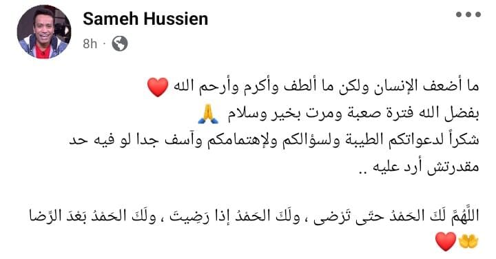 وكتب سامح حسين من خلال حسابه الرسمي عبر موقع التواصل الاجتماعي "فيسبوك"، قال: ما أضعف الإنسان ولكن ما ألطف وأكرم وأرحم الله.. بفضل الله فترة صعبة ومرت بخير وسلام ".