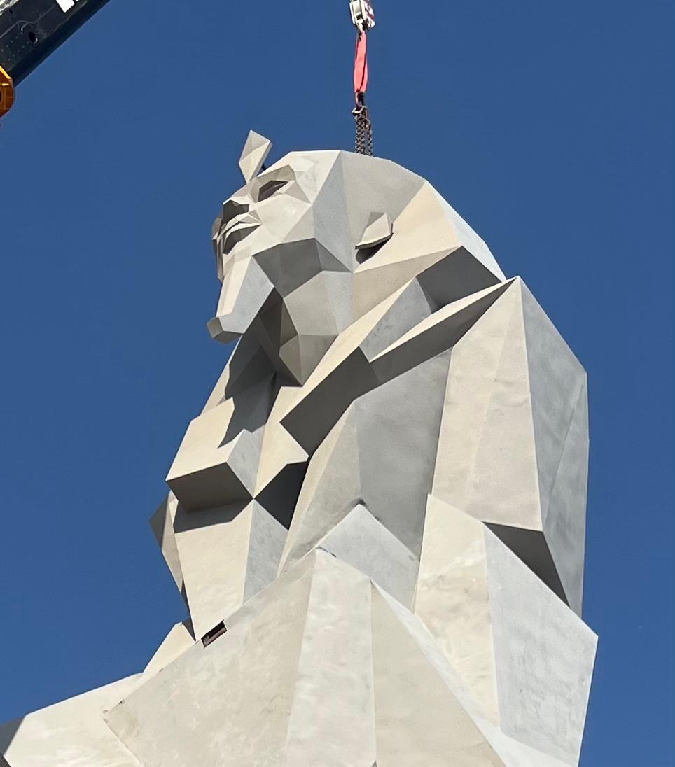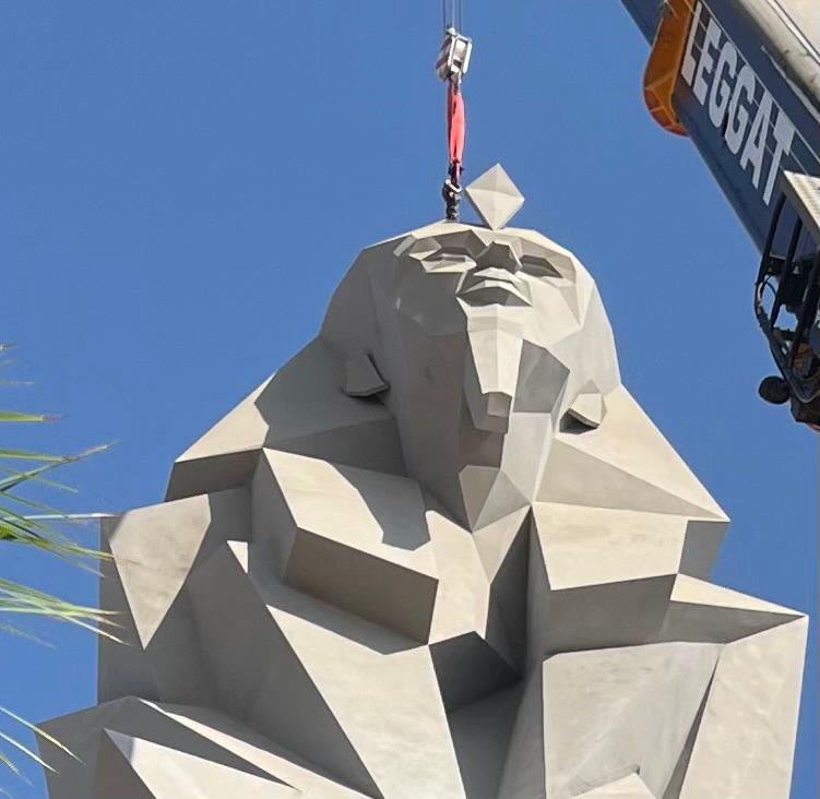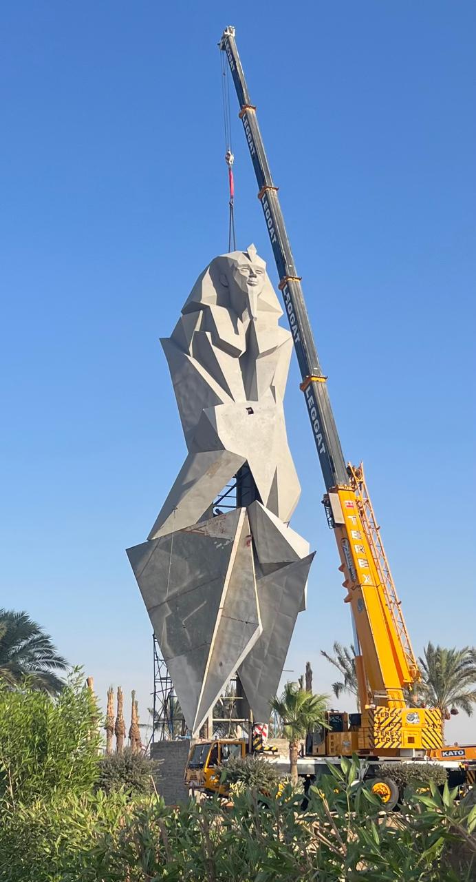 ويبلغ ارتفاع التمثال نحو 27 مترًا، ليجسد الهوية المصرية الخالدة بأسلوب هندسي تجريدي يمزج بين أصالة الحضارة المصرية وملامح الفن الحديث، في إطار الاستعدادات الجارية لافتتاح المتحف المصري الكبير.
