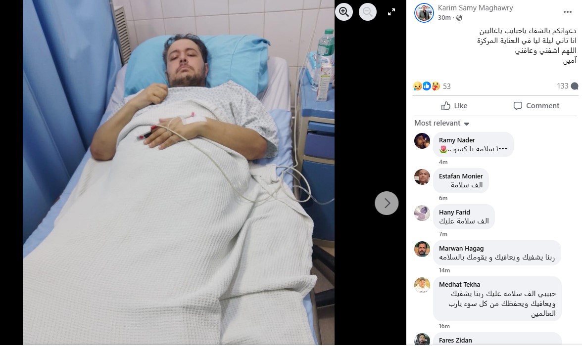 ونشر كريم سامي مغاوري صورة له من داخل العناية المركزة، وكتب من خلال حسابه الرسمي عبر موقع التواصل الاجتماعي "فيسبوك"، قال:" دعواتكم بالشفاء ياحبايب ياغاليين، أنا تاني ليلة ليا في العناية المركزة، اللهم اشفني وعافني.. آمين".