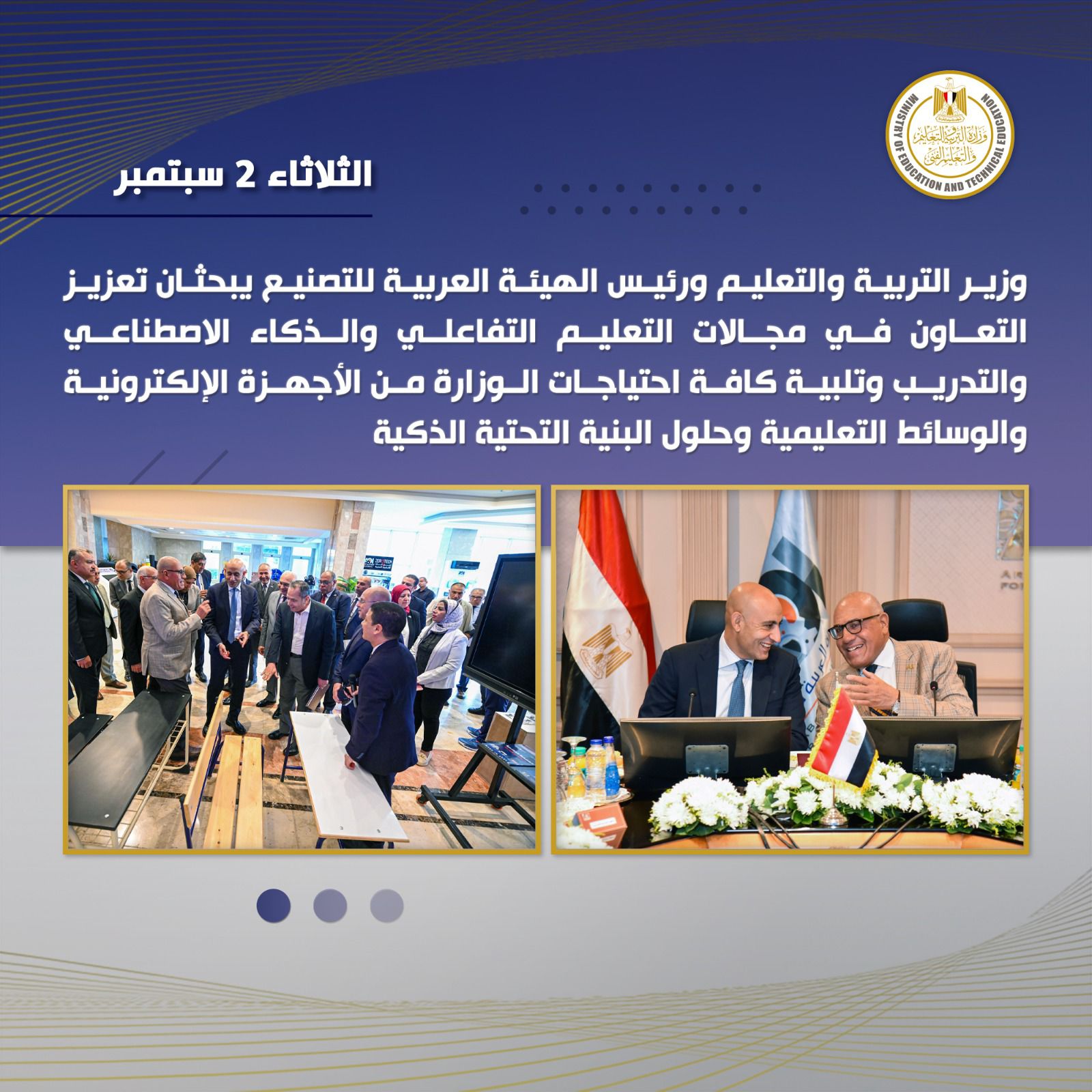 وخلال اللقاء، أكد السيد محمد عبداللطيف وزير التربية والتعليم والتعليم الفني، حرص الوزارة على تعزيز أطر التعاون مع الهيئة العربية للتصنيع، بما يسهم في تحقيق نقلة نوعية في تطوير العملية التعليمية، من خلال إدخال أحدث الوسائط التكنولوجية والتفاعلية داخل المدارس، مشيرًا إلى أن الوزارة تضع على رأس أولوياتها التوسع في تطبيقات الذكاء الاصطناعي، والتحول الرقمي الشامل للمنظومة التعليمية، مستعرضا في هذا الإطار التعاون الوثيق الذي يتم مع اليابان في مجال التعليم بما يتوافق مع رؤية الدولة المصرية لبناء الإنسان المصري وإعداد أجيال قادرة على مواكبة تحديات المستقبل.