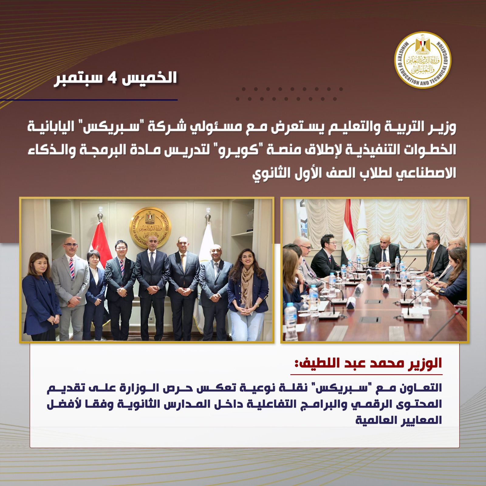 عقد السيد/ محمد عبد اللطيف وزير التربية والتعليم والتعليم الفني، لقاءً مع مسئولي شركة "سبريكس" اليابانية، وذلك لاستعراض الخطوات التنفيذية لإطلاق منصة "كويرو" لتدريس مادة البرمجة والذكاء الاصطناعي لطلاب الصف الأول الثانوي بداية من العام الدراسي ٢٠٢٥ / ٢٠٢٦، وذلك في إطار جهود الوزارة لتوظيف التكنولوجيا الحديثة والذكاء الاصطناعي في العملية التعليمية.