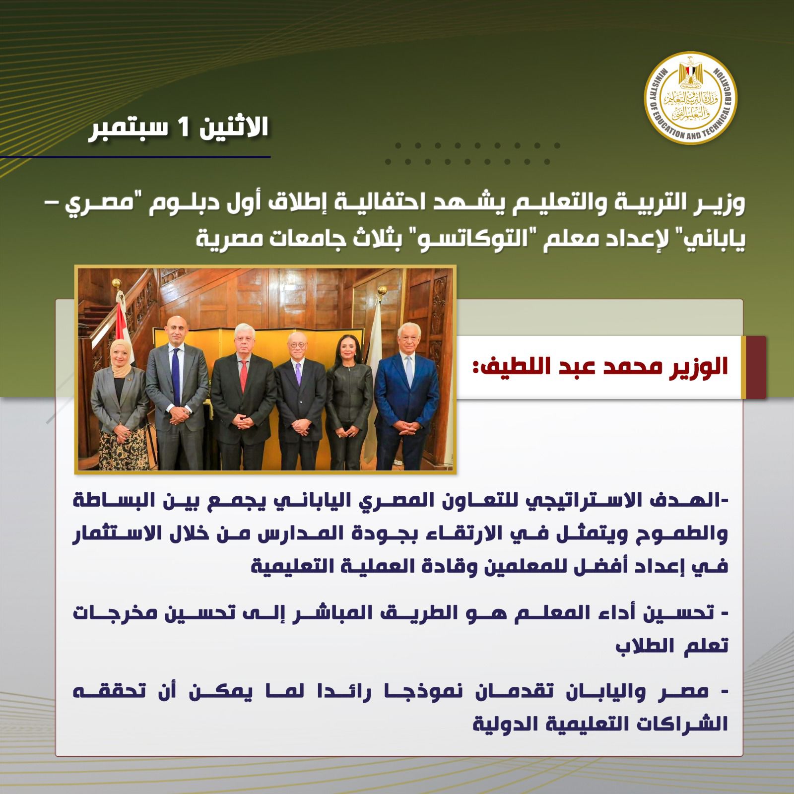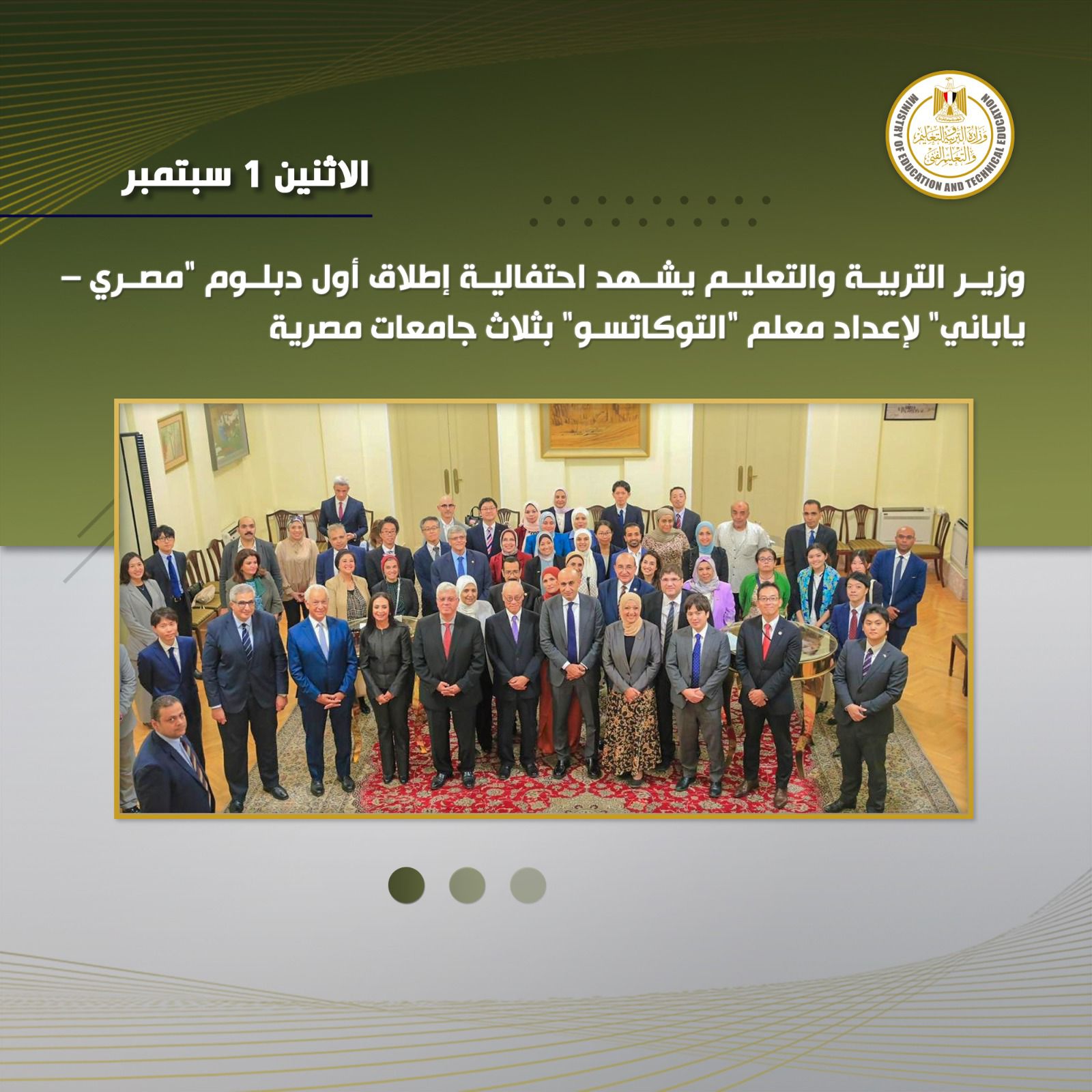 في إطار جهود الدولة التي تركز على إعداد كوادر بشرية تساهم في تطوير التعليم، شهد السيد محمد عبد اللطيف وزير التربية والتعليم والتعليم الفني فعاليات احتفالية إطلاق أول دبلوم "مصري – ياباني" لإعداد معلم أنشطة التعلم الشامل "التوكاتسو"، والذي ينفذ في جامعات عين شمس، وحلوان، والجامعة المصرية اليابانية للعلوم والتكنولوجيا، بالشراكة مع جامعة فوكوي اليابانية، وذلك اعتبارًا من العام الأكاديمي 2025 / 2026.