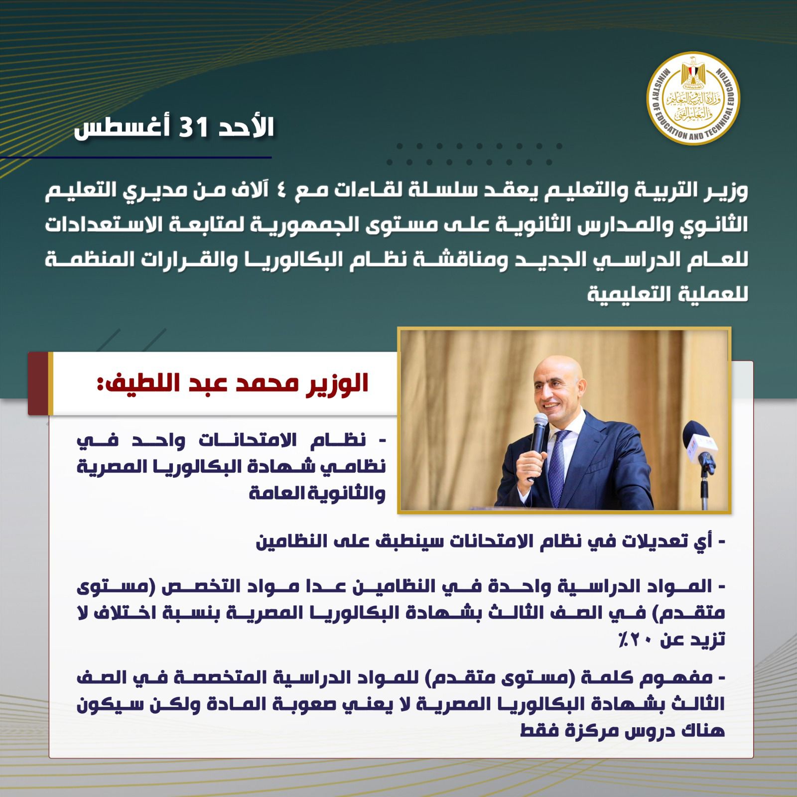 ودعا السيد الوزير محمد عبد اللطيف الطلاب وأولياء الأمور لاستيفاء كافة المعلومات من المنصات الرسمية لوزارة التربية والتعليم في إطار حملة التوعية حول النظام، فضلا عن المشاركة في ندوات التوعية التي تقدمها المديريات والإدارات التعليمية والمدارس مباشرة لأولياء الأمور وعدم الاعتماد على أي مصادر خارجية للاستفسار عن النظام حتى لا يتلقوا أي معلومات غير دقيقة.