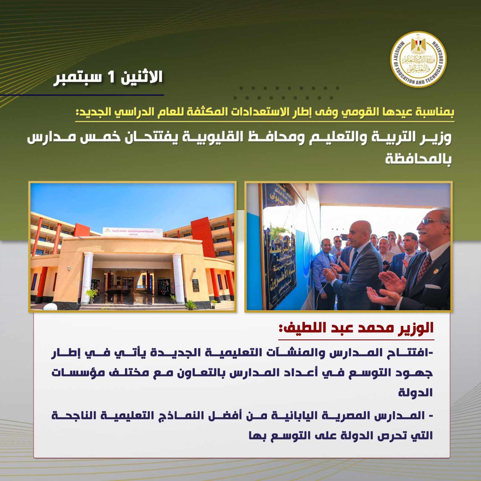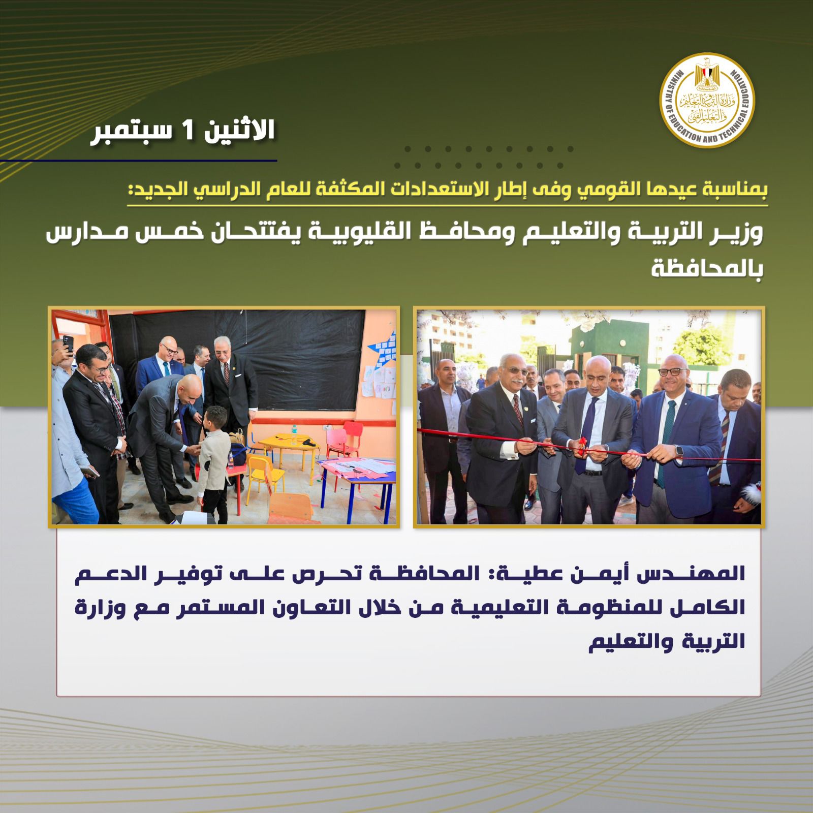 افتتح السيد/ محمد عبد اللطيف وزير التربية والتعليم والتعليم الفني، والمهندس/ أيمن عطية محافظ القليوبية، خمس مدارس جديدة بمحافظة القليوبية والتي تم تجهيزها وفق أحدث المعايير التعليمية، وذلك في إطار الاحتفال بعيد المحافظة القومى، وفى ضوء الاستعدادات المكثفة لانطلاق العام الدراسي الجديد ٢٠٢٥ / ٢٠٢٦.