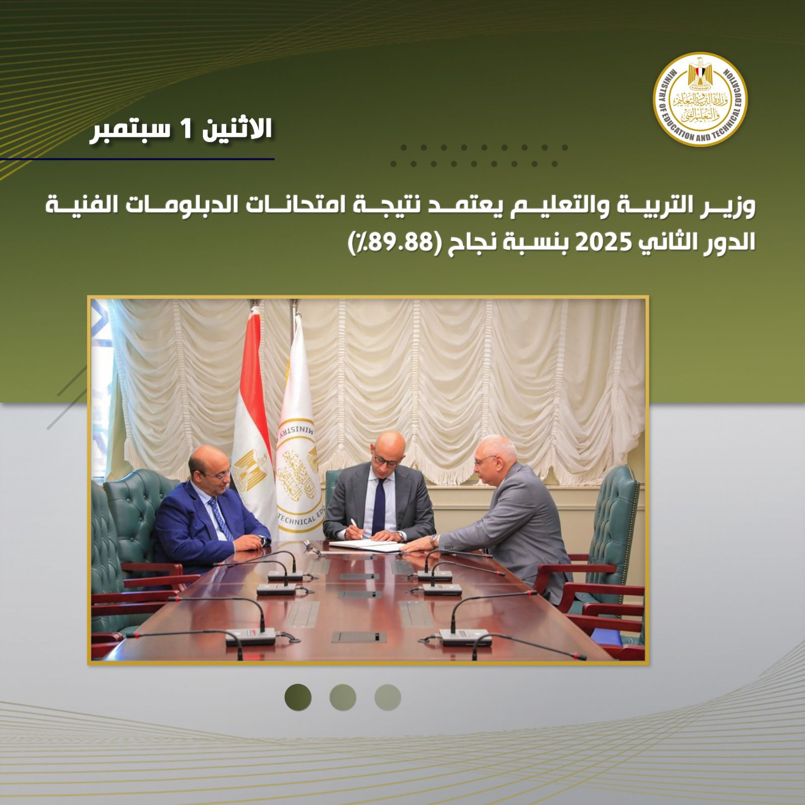 اعتمد السيد/ محمد عبد اللطيف، وزير التربية والتعليم والتعليم الفنى، نتيجة امتحانات الدبلومات الفنية للدور الثاني للعام الدراسي ٢٠٢٤/ ٢٠٢٥، وذلك بنسبة نجاح (89.88%).