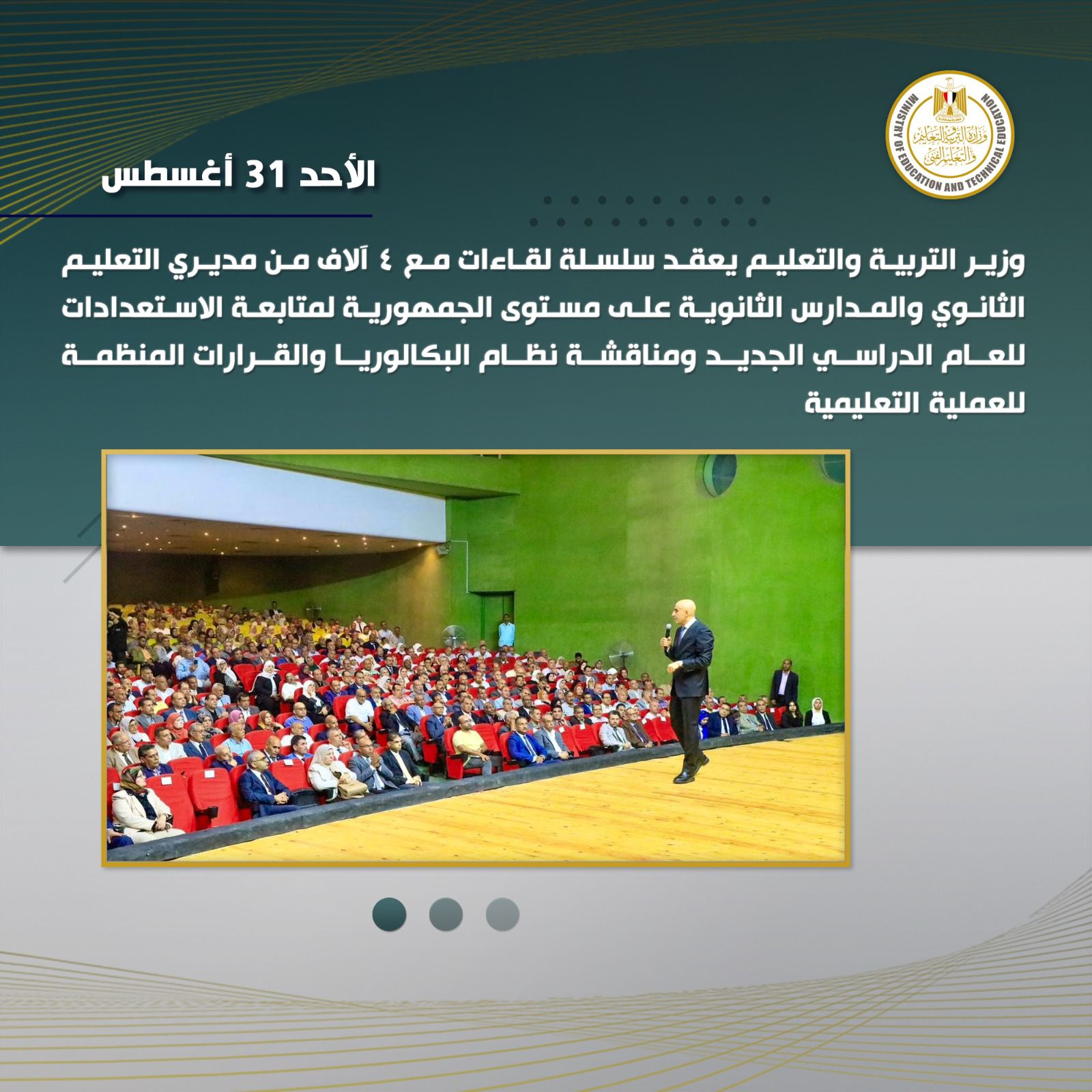 عقد السيد محمد عبد اللطيف، وزير التربية والتعليم والتعليم الفني، سلسلة من اللقاءات الموسعة مع ما يقرب من ٤ آلاف من مديري المرحلة الثانوية ومديري المدارس الرسمية والرسمية لغات للمرحلة الثانوية على مستوى الجمهورية، وذلك بالمدينة التعليمية في السادس من أكتوبر، بهدف متابعة تنفيذ السياسات التعليمية ومناقشة آليات الاستعداد للعام الدراسي الجديد ونظام شهادة البكالوريا المصرية.