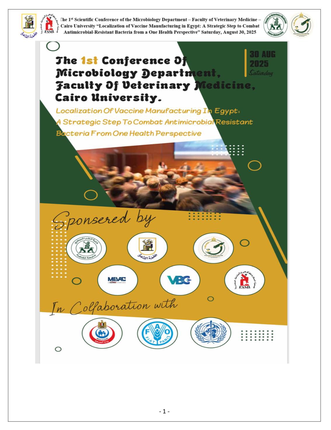 نظمت كلية الطب البيطري بجامعة القاهرة، تحت رعاية الدكتور محمد سامي عبد الصادق رئيس الجامعة، وبحضور الدكتور محمود السعيد نائب رئيس الجامعة لشئون الدراسات العليا والبحوث، وإشراف الدكتورة إيمان بكر عميد الكلية، المؤتمر العلمي لقسم الميكروبيولوجي تحت عنوان "توطين صناعة اللقاحات في مصر: خطوة استراتيجية لمواجهة البكتيريا المقاومة للمضادات الحيوية من منظور الصحة الواحدة".