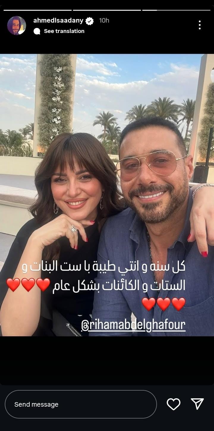 ونشر أحمد السعدني صورة تجمعه بـ ريهام عبد الغفور من خلال حسابه الرسمي عبر موقع تبادل الصور والفيديوهات القصيرة "إنستجرام"، عبر خاصية ستوري، ووجه لها بعض الكلمات، وقال: "كل سنة وانتي طيبة يا ست البنات والستات والكائنات بشكل عام".