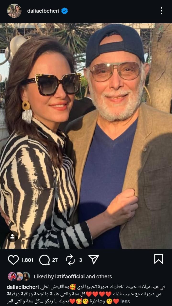 ونشرت داليا البحيري صورة لـ ريهام عبد الغفور تجمعها بوالدها الراحل أشرف عبد الغفور، من خلال حسابها الرسمي عبر موقع تبادل الصور والفيديوهات القصيرة "إنستجرام"، ووجهت لها رسالة، وقالت: "في عيد ميلادك حبيت أختارلك صورة تحبيها أوي وملاقتش أحلى من صورتك مع حبيب قلبك، كل سنة وأنتي طيبة وناجحة وراقية ورقيقة وشاطرة.. بحبك يا ريكو، كل سنة وأنتي طيبة يا قمر".