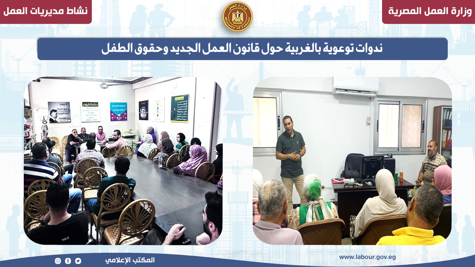 وفي السياق ذاته نظم مكتب تفتيش عمل المحلة الكبرى ندوة بشركة الشافعي للملابس الجاهزة، شارك فيها 25 عاملًا من إجمالي 85 عاملًا بالمنشأة، للتعريف بأهم بنود القانون التي تحقق التوازن بين حقوق وواجبات العامل وصاحب العمل. كما أقيمت ندوة توعوية بمصنع النهر الحلو للحلويات بمدينة طنطا بعنوان "مخاطر عمالة الأطفال"، شارك فيها 15 من العاملين، حيث جرى استعراض الجوانب القانونية المنظمة لتشغيل الأطفال والتأكيد على حظر تشغيل من هم دون الخامسة عشرة أو إقحامهم في الأعمال الخطرة.