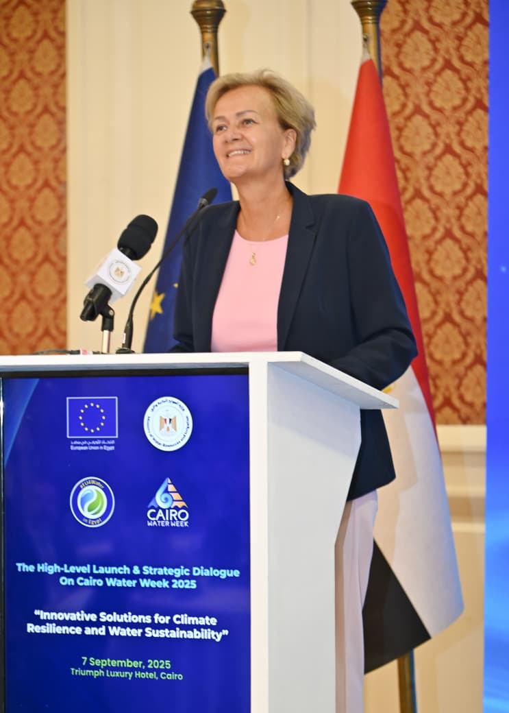 وفى كلمتها بالإحتفالية .. ذكرت السيدة السفيرة/ أنجلينا أيخهورست “إنّ الاتحاد الأوروبي يعتزّ بشراكته كمنظّم مشارك في أسبوع القاهرة للمياه منذ انطلاقه عام ٢٠١٨، وقد آمن منذ اليوم الأول بقدرة القاهرة على استضافة المنصة الأكثر تفاعلا في المنطقة، حيث تلتقي السياسات بالاحتياجات من بالاحتياجات من خلال تقديم حلول عملية وواقعية لتحديات قطاع المياه في المنطقه ، ونحن اليوم نؤكد التزامنا الراسخ بهذا المسار .