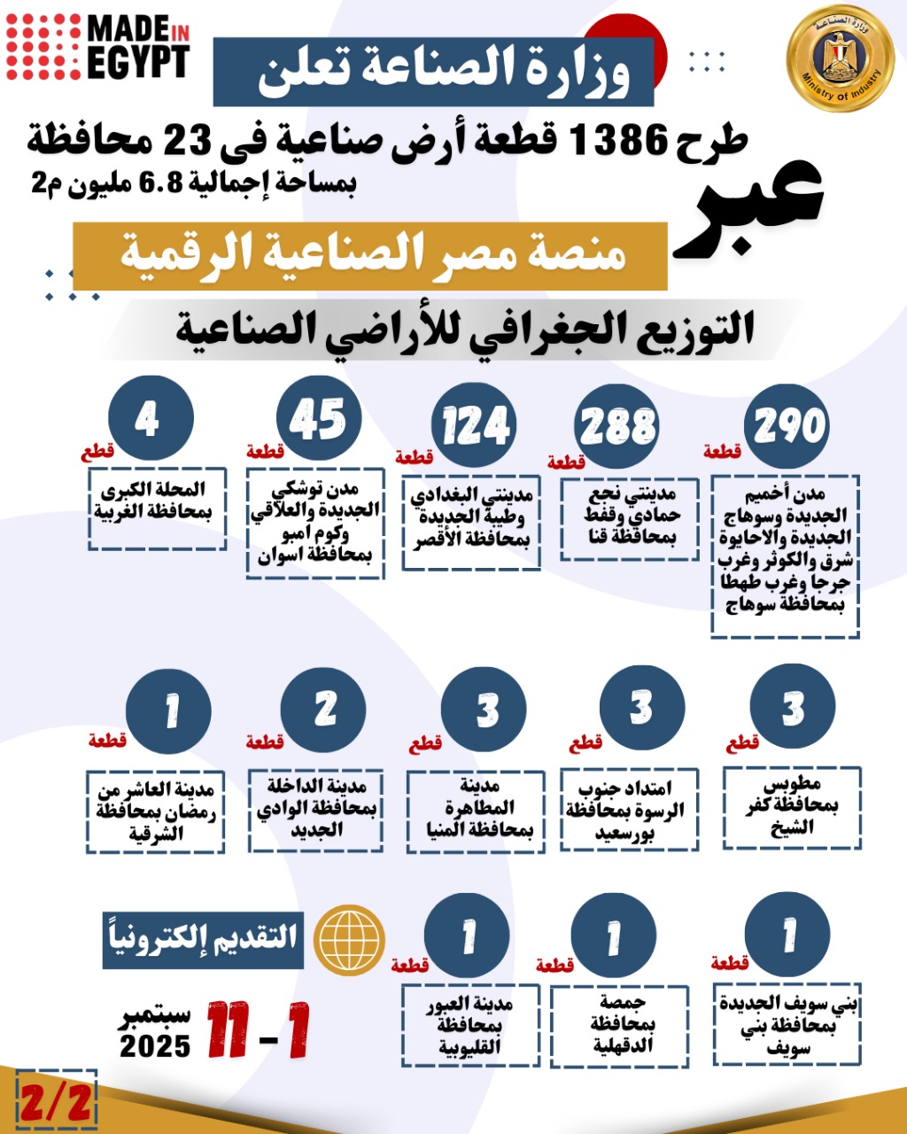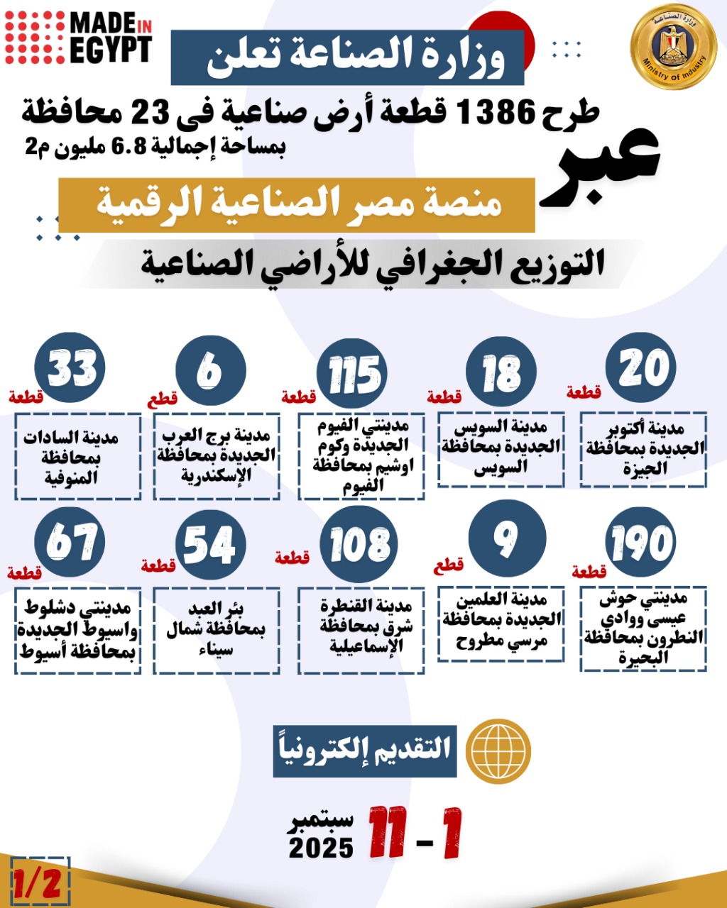 وحول التوزيع الجغرافي للأراضي الصناعية فسيتم طرح ٢٠ قطعة بمدينة أكتوبر الجديدة بمحافظة الجيزة، و١٨ قطعة بمدينة السويس الجديدة بمحافظة السويس، و١١٥ قطعة بمدينتي الفيوم الجديدة وكوم اوشيم بمحافظة الفيوم، و٦ قطع بمدينة برج العرب الجديدة بمحافظة الإسكندرية، و٣٣ قطعة بمدينة السادات بمحافظة المنوفية، و١٩٠ قطعة بمدينتي حوش عيسي ووادى النطرون بمحافظة البحيرة، و٩ قطع بمدينة العلمين الجديدة بمحافظة مرسي مطروح، و١٠٨ قطعة بمدينة القنطرة شرق بمحافظة الإسماعيلية، و٥٤ قطعة ببئر العبد بمحافظة شمال سيناء، و٦٧ قطعة بمدينتي دشلوط واسيوط الجديدة بمحافظة أسيوط، و٢٩٠ قطعة ارض بمدن اخميم الجديدة وسوهاج الجديدة والاحايوة شرق والكوثر وغرب جرجا وغرب طهطا بمحافظة سوهاج، و٢٨٨ قطعة بمدينتي نجع حمادي وقفط بمحافظة قنا، و١٢٤ قطعة بمدينتي البغدادي وطيبة الجديدة بمحافظة الأقصر، و٤٥ قطعة بمدن توشكي الجديدة والعلاقي وكوم امبو بمحافظة اسوان، و٤ قطع بالمحلة الكبرى بمحافظة الغربية، و٣ قطع بمطوبس بمحافظة كفر الشيخ، و٣ قطع بامتداد جنوب الرسوة بمحافظة بورسعيد، و٣ قطع بمدينة المطاهرة بمحافظة المنيا، وقطعتين بمدينة الداخلة بمحافظة الوادي الجديد، وقطعة بمدينة العاشر من رمضان بمحافظة الشرقية، وقطعة ببني سويف الجديدة بمحافظة بني سويف، وقطعة بجمصة بمحافظة الدقهلية، وقطعة بمدينة العبور بمحافظة القليوبية.