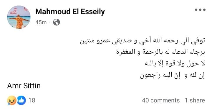 وكتب محمود العسيلي من خلال حسابه الرسمي عبر موقع التواصل الاجتماعي "فيسبوك"، قال: "توفي الي رحمه الله أخي و صديقي عمرو ستين.. برجاء الدعاء له بالرحمة و المغفرة.. لا حول ولا قوة إلا بالله.. إن لله وإنّ اليه راجعون".