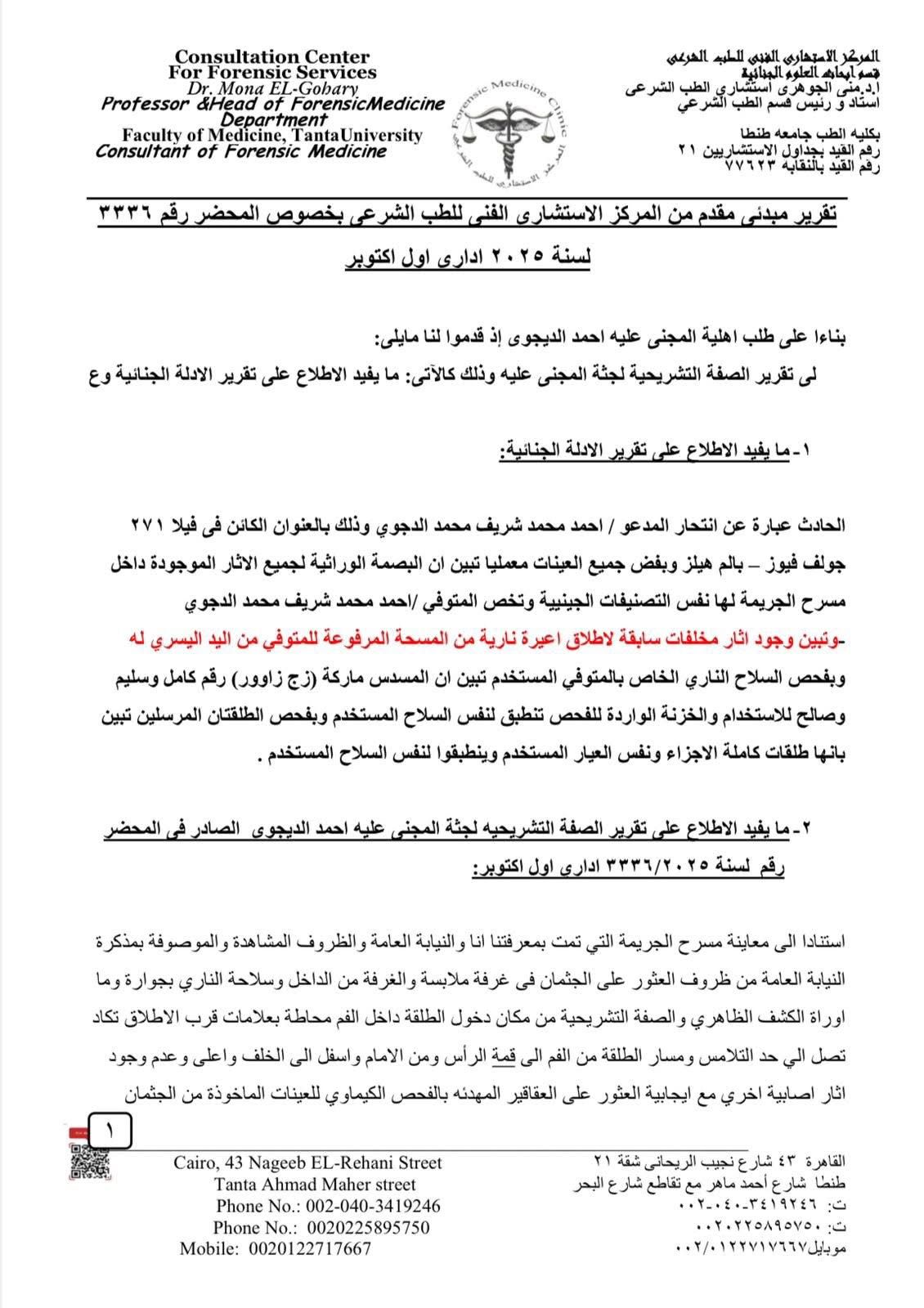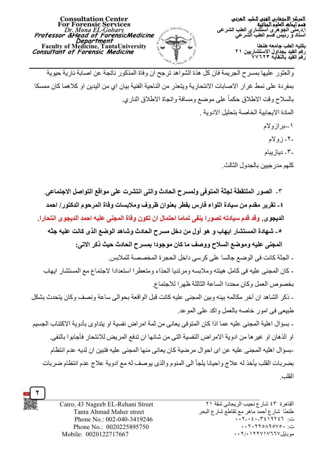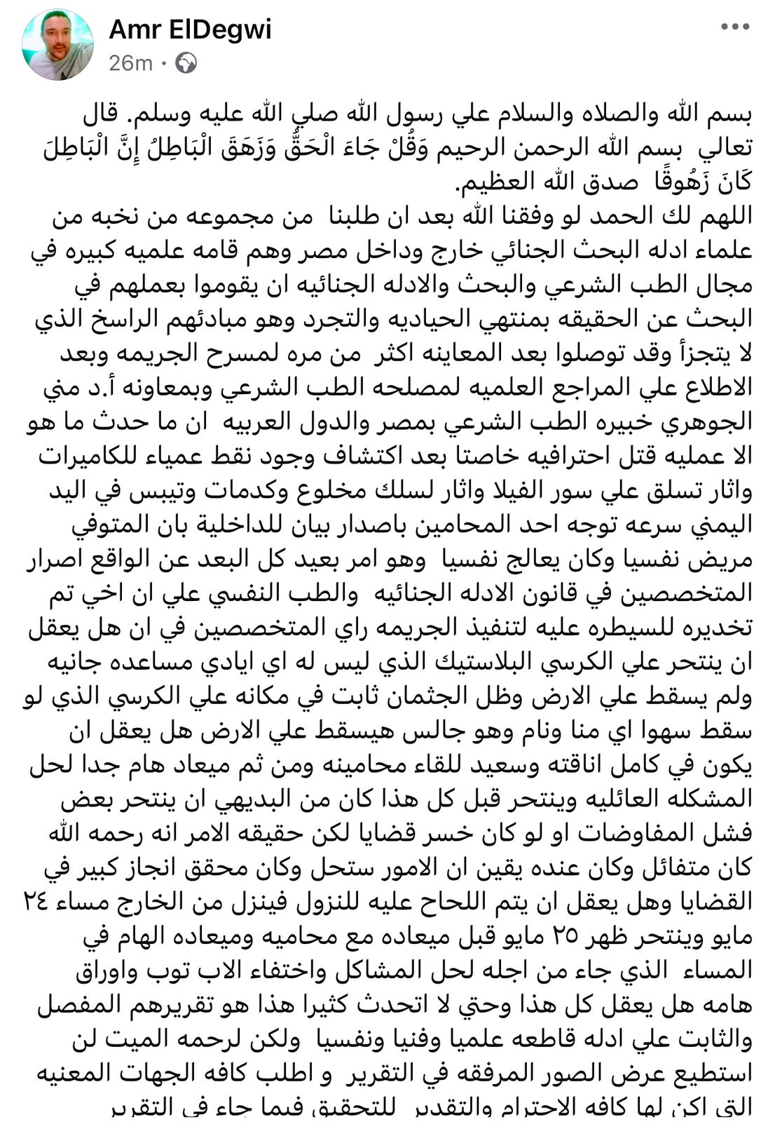 ولفت إلى اختفاء جهاز اللاب توب وأوراق مهمة من مسرح الحادث، مطالبًا جميع الجهات المعنية بالتحقيق فيما ورد في التقرير الفني الذي استند إلى أدلة وصفها بـ القاطعة علميًا وفنيًا ونفسيًا، من أجل الكشف عن الجناة وتحقيق العدالة.