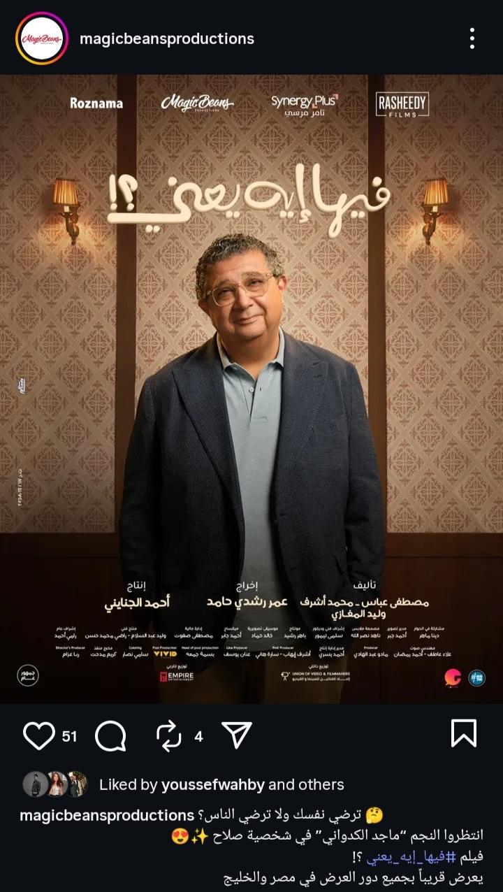 فيلم "فيها إيه يعني" من بطولة ماجد الكدواني، غادة عادل، أسماء جلال، مصطفى غريب، وميمي جمال، ريتال عبدالعزيز، وإنتاج ماجيك بينز للمنتج أحمد الجنايني، وسينرجي بلس تامر مرسي، ورشيدي فيلمز، وروزناما، وهو من تأليف مصطفي عباس ومحمد أشرف ووليد المغازي، إخراج عمر رشدي حامد.