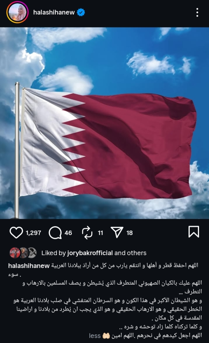 حرصت الفنانة حلا شيحة على دعم البلاد العربية قطر، خاصة بعد الأحداث المأسوية التي تعرضت لها البلاد مساء أمس الثلاثاء، من قِبل الكيان الصهيوني.