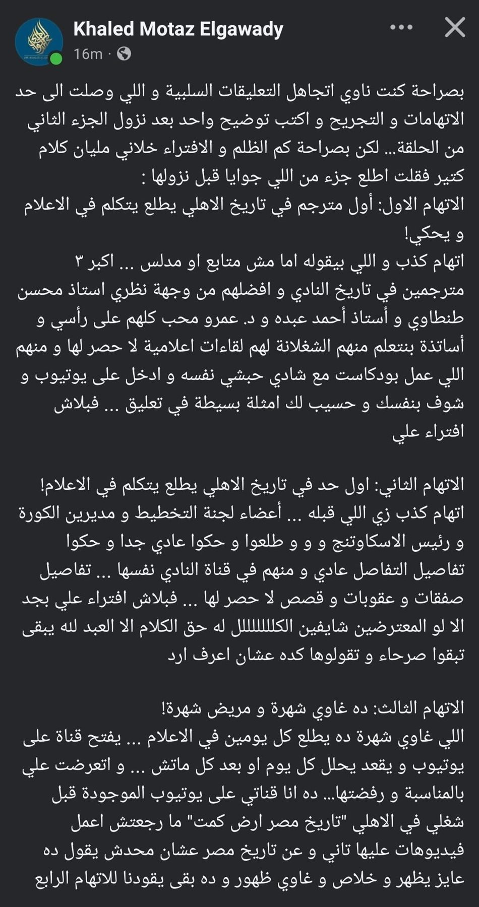 واختتم: ملحوظة اخيرة: انا عمر ما حد من إدارة النادي وكل الإدارة معها رقمي كلمني او بعت لي رسالة يطلب اني ماطلعش في الاعلام لأنهم افاضل ودماغهم كبيرة وعارفين ان كل اللي بقوله قصص عادية لطيفة بيتقال كل يوم اكتر منها مئة مرة من إداريين او لاعبين سابقين واني دايما بظهر احترامي لهم وعمري ما اسأت لحد... واهو باعلنها لو ادارة النادي مش عايزني اطلع خالص وماظهرش ابدا رقمي معهم مجرد رسالة وانا سأمتثل فورا حتى لو ده مش فير بس طلبات الأهلي عندي أوامر... بس كده.