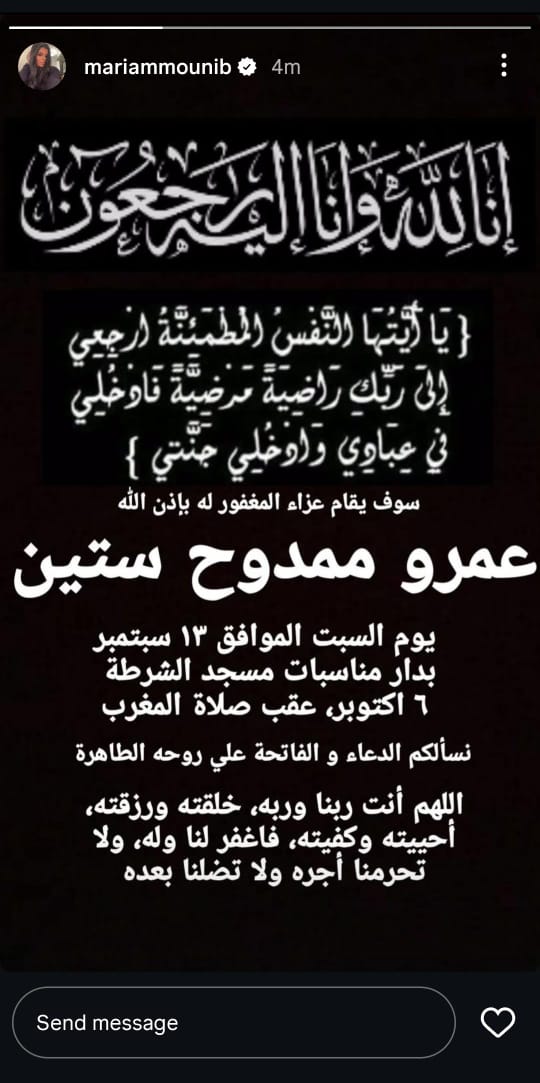 وكتبت مريم عامر منيب من خلال حسابها الرسمي عبر موقع تبادل الصور والفيديوهات القصيرة "إنستجرام"، عبر خاصية ستوري: "إنا لله وإنا إليه راجعون.. يا أيتها النفس المطمئنة ارجعي إلى ربك راضية مرضية فادخلي في عبادي وادخلي جنتي".