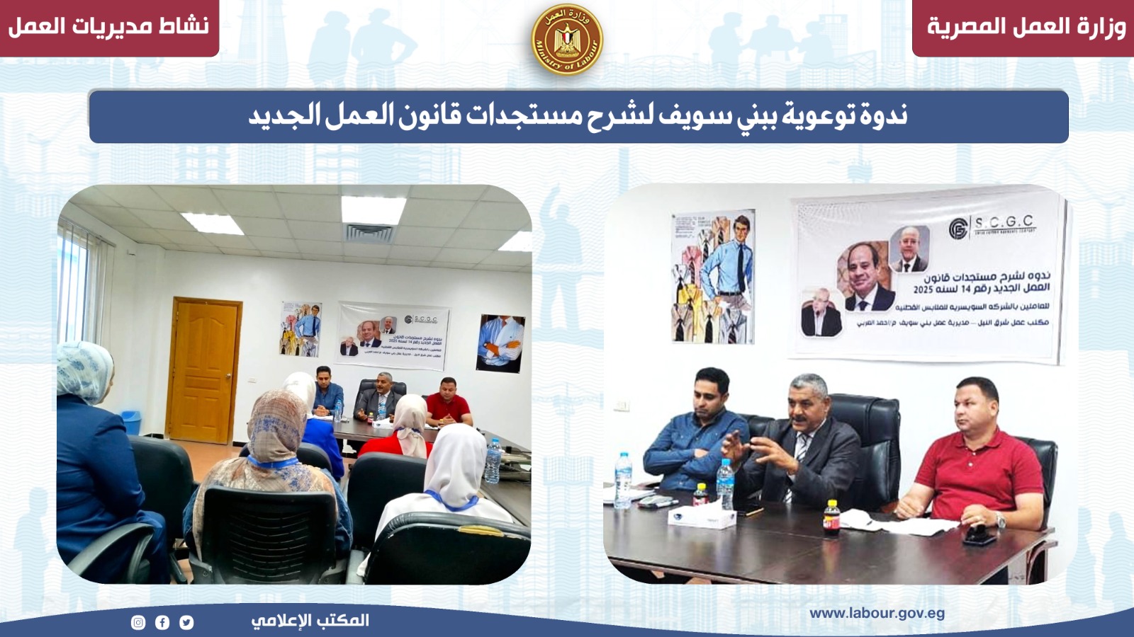 نظمت مديرية العمل ببني سويف ندوة توعوية بالشركة السويسرية لصناعة الملابس الجاهزة بالمنطقة الصناعية ببياض العرب شرق النيل، بحضور 50 عاملاً وعاملة، بهدف شرح مستجدات قانون العمل الجديد رقم 14 لسنة 2025 وما يتضمنه من تعديلات تخص حقوق وواجبات طرفي الإنتاج.