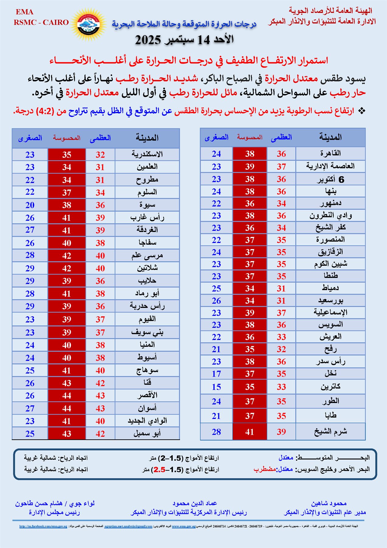 درجات الحرارة المتوقعة اليوم الأحد 14 سبتمبر: