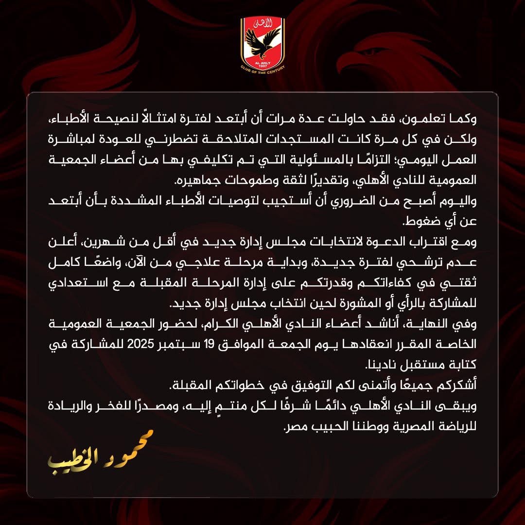 وفي ختام رسالته، ناشد الخطيب أعضاء النادي الأهلي لحضور الجمعية العمومية الخاصة يوم الجمعة 19 سبتمبر 2025، للمشاركة في رسم مستقبل النادي، مؤكدًا أن الأهلي سيظل مصدر فخر لكل منتمٍ إليه، وريادة للرياضة المصرية.