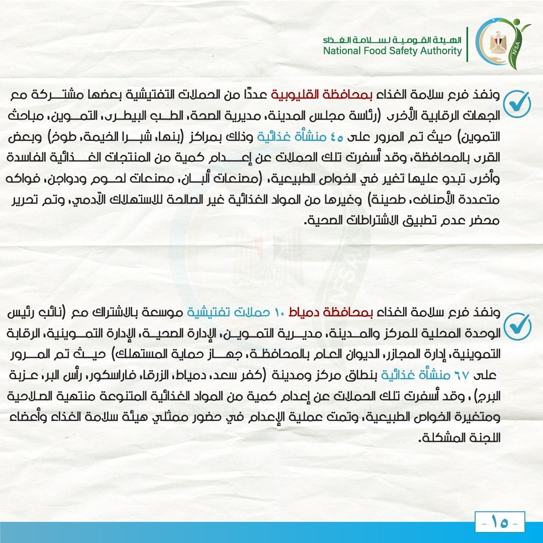 ونفذ فرع سلامة الغذاء بمحافظة القليوبية عددًا من الحملات التفتيشية بعضها مشتركة مع الجهات الرقابية الأخرى (رئاسة مجلس المدينة، مديرية الصحة، الطب البيطرى، التموين، مباحث التموين) حيث تم المرور على 45 منشأة غذائية وذلك بمراكز (بنها، شبرا الخيمة،طوخ) وبعض القرى بالمحافظة، وقد أسفرت تلك الحملات عن إعدام كمية من المنتجات الغذائية الفاسدة وأخرى تبدو عليها تغير في الخواص الطبيعية، (مصنعات ألبان، مصنعات لحوم ودواجن، فواكه متعددة الأصناف، طحينة) وغيرها من المواد الغذائية غير الصالحة للاستهلاك الآدمي، وتم تحرير محضر عدم تطبيق الاشتراطات الصحية.