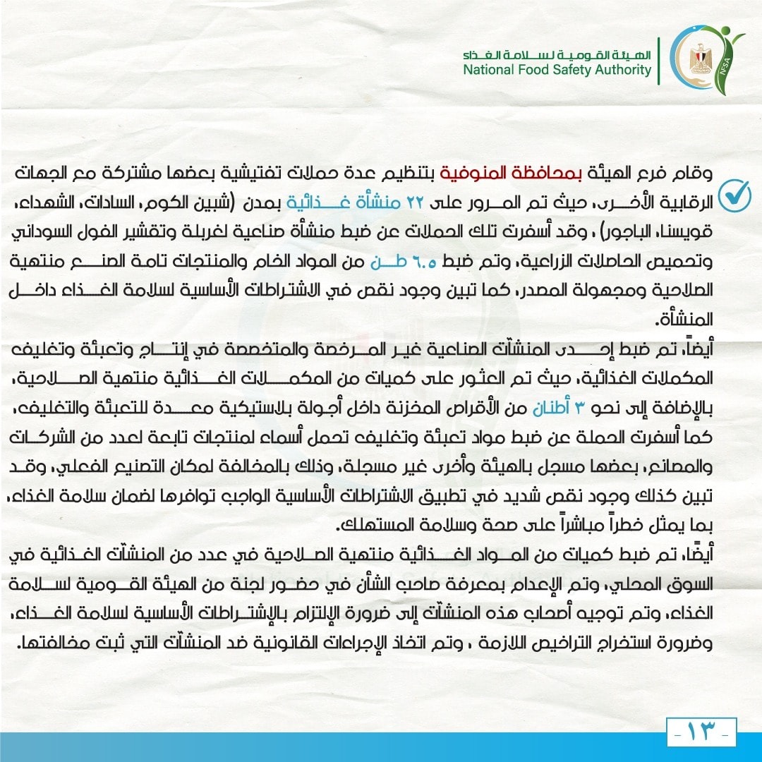 وقام فرع الهيئة بمحافظة المنوفية بتنظيم عدة حملات تفتيشية بعضها مشتركة مع الجهات الرقابية الأخرى، حيث تم المرور على 22 منشأة غذائية بمدن (شبين الكوم، السادات، الشهداء، قويسنا، الباجور)، وقد أسفرت تلك الحملات عن ضبط منشأة صناعية لغربلة وتقشير الفول السوداني وتحميص الحاصلات الزراعية، وتم ضبط 6.5 طن من المواد الخام والمنتجات تامة الصنع منتهية الصلاحية ومجهولة المصدر، كما تبين وجود نقص في الاشتراطات الأساسية لسلامة الغذاء داخل المنشأة.