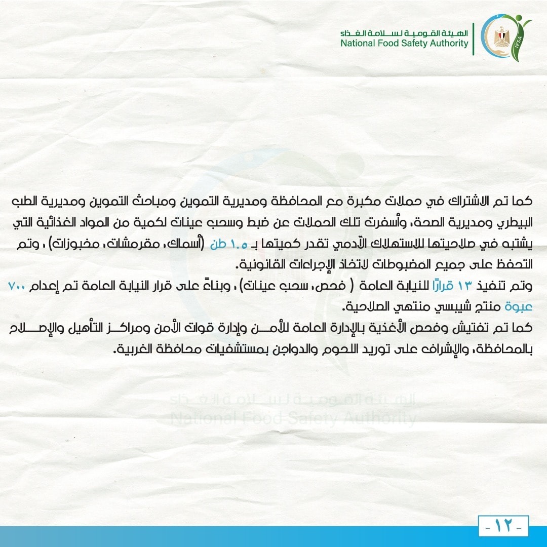 كما تم الاشتراك في حملات مكبرة مع المحافظة ومديرية التموين ومباحث التموين ومديرية الطب البيطري ومديرية الصحة، وأسفرت تلك الحملات عن ضبط وسحب عينات لكمية من المواد الغذائية التي يشتبه في صلاحيتها للاستهلاك الآدمي تقدر كميتها بـ 1.5 طن (أسماك، مقرمشات، مخبوزات)، وتم التحفظ على جميع المضبوطات لاتخاذ الإجراءات القانونية.