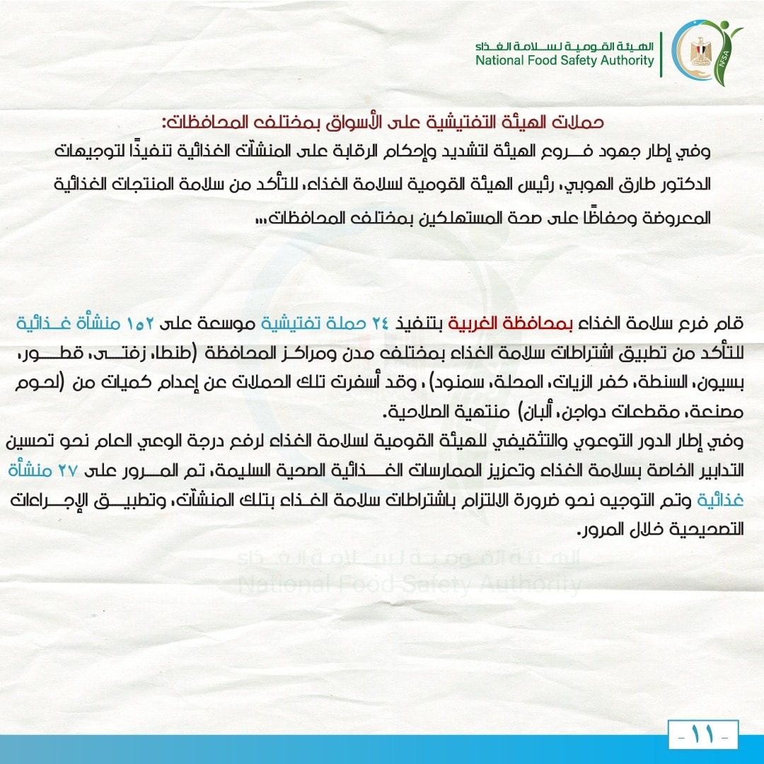 وفي إطار الدور التوعوي والتثقيفي للهيئة القومية لسلامة الغذاء لرفع درجة الوعي العام نحو تحسين التدابير الخاصة بسلامة الغذاء وتعزيز الممارسات الغذائية الصحية السليمة، تم المرور على 27 منشأة غذائية وتم التوجيه نحو ضرورة الالتزام باشتراطات سلامة الغذاء بتلك المنشآت، وتطبيق الإجراءات التصحيحية خلال المرور.