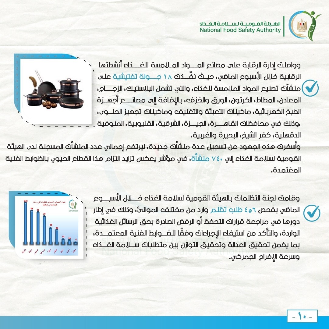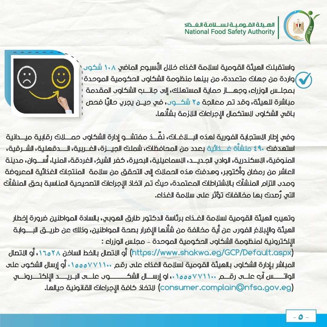 واستقبلت الهيئة القومية لسلامة الغذاء خلال الأسبوع الماضي 108 شكوى واردة من جهات متعددة، من بينها منظومة الشكاوى الحكومية الموحدة بمجلس الوزراء، وجهاز حماية المستهلك، إلى جانب الشكاوى المقدمة مباشرة للهيئة، وقد تم معالجة 25 شكوى، في حين يجري حاليًا فحص باقي الشكاوى لاستكمال الإجراءات اللازمة بشأنها.
