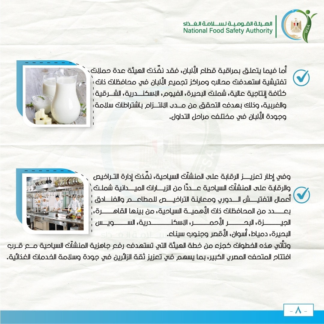 أما فيما يتعلق بمراقبة قطاع الألبان، فقد نفّذت الهيئة عدة حملات تفتيشية استهدفت محالب ومراكز تجميع الألبان في محافظات ذات كثافة إنتاجية عالية، شملت البحيرة، الفيوم، الاسكندرية، الشرقية والغربية، وذلك بهدف التحقق من مدى الالتزام باشتراطات سلامة وجودة الألبان في مختلف مراحل التداول.